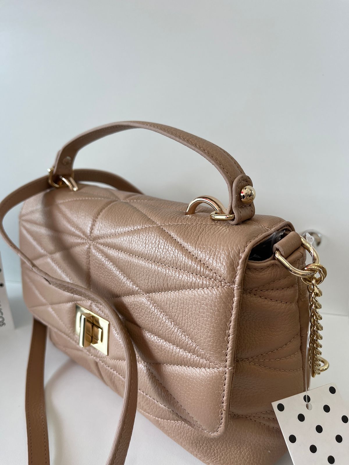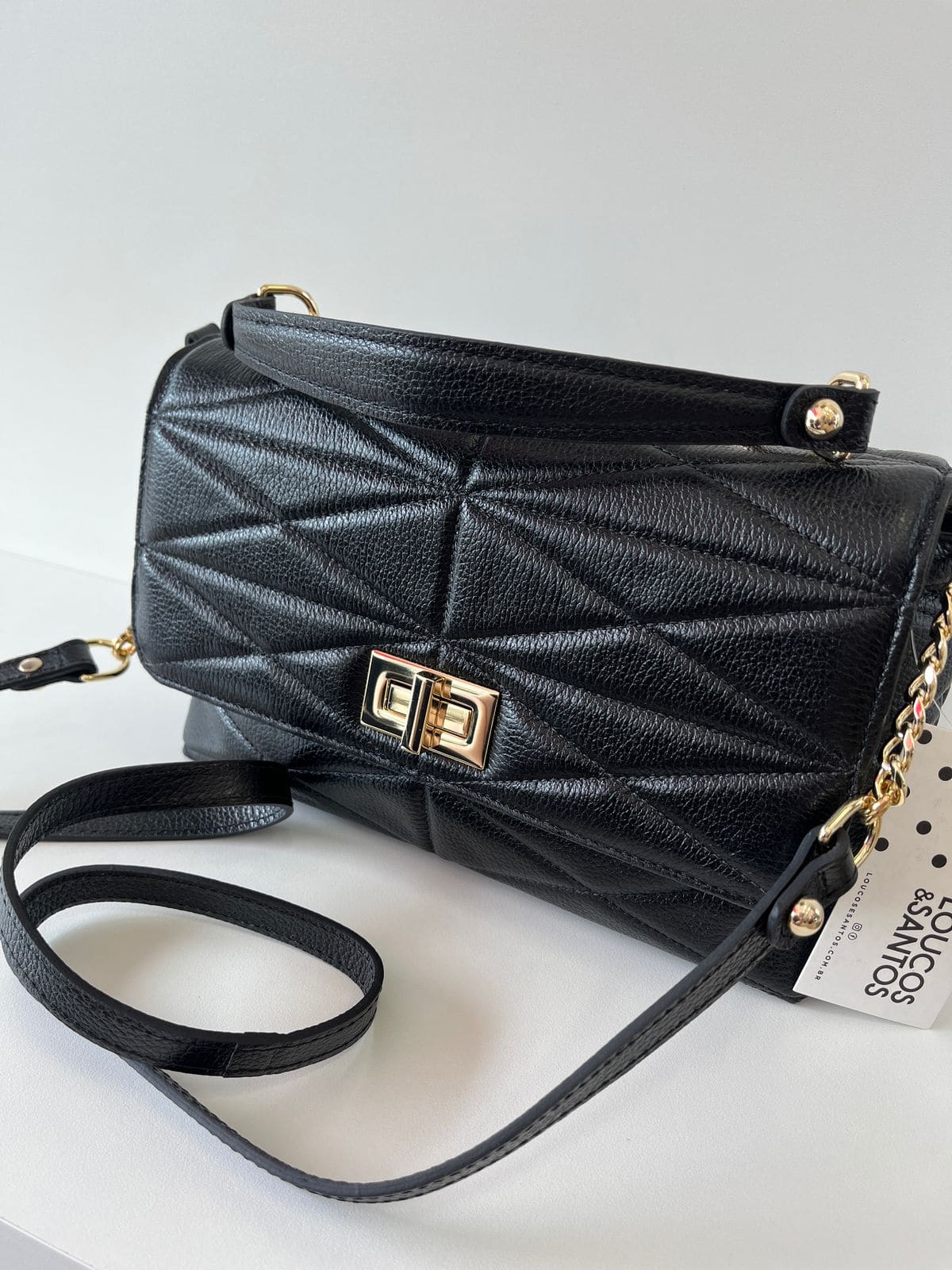 Bolsa Loucos e Santos, em couro nas cores preta, e nude, com duas opções de alça.