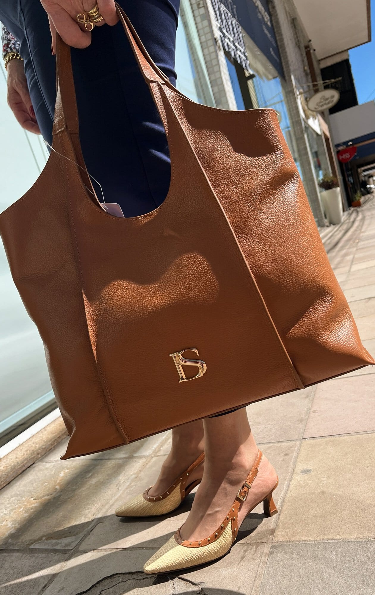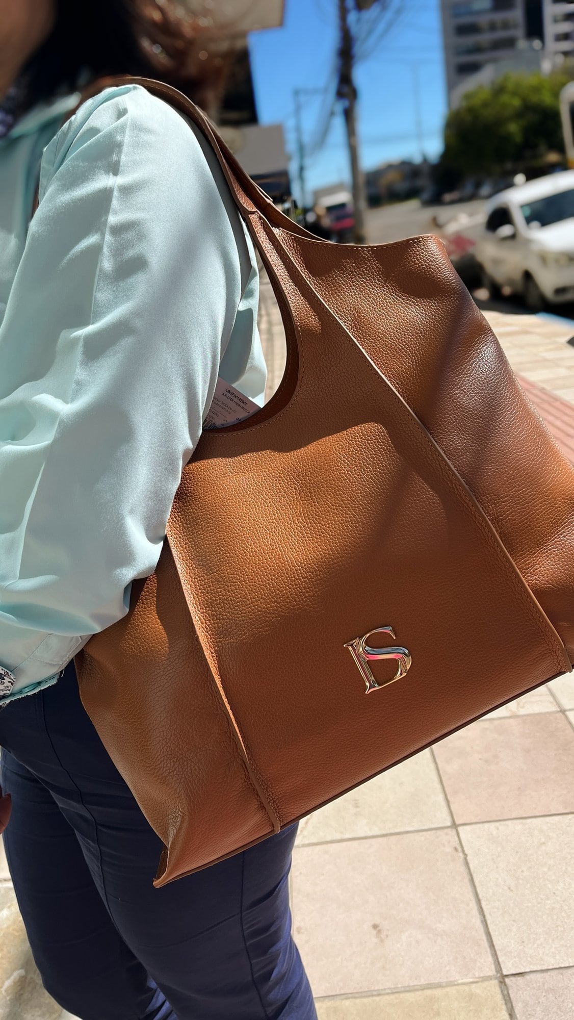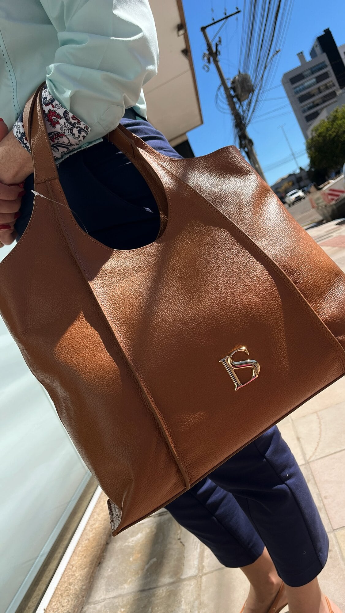 Bolsa em couro na cor caramelo, tamanho grande, com zíper.