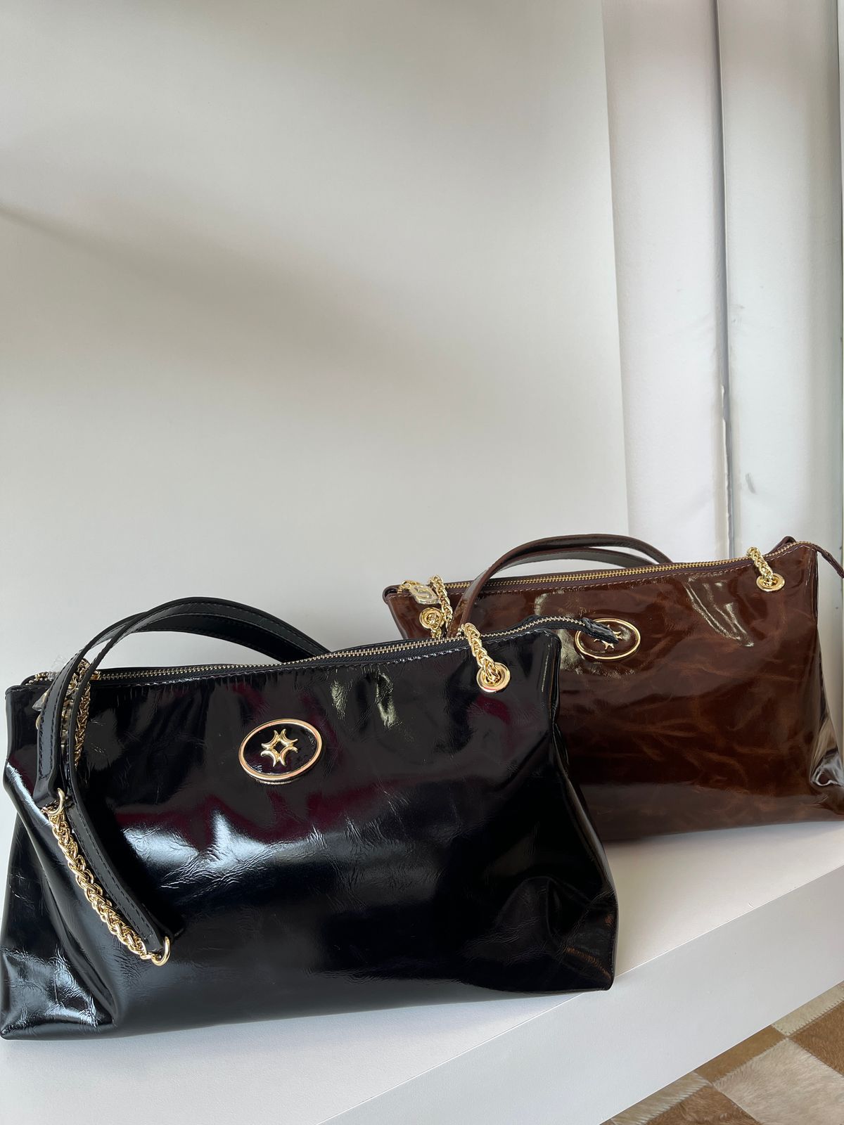 Bolsa tote de tamanho grande com acabamento macio para caimento do couro na parte central. Fechamento principal em zíper de metal. Alça de ombro de couro e corrente, sendo fixa na bolsa. Detalhe para placa luas com forração em couro na parte frontal da bolsa.