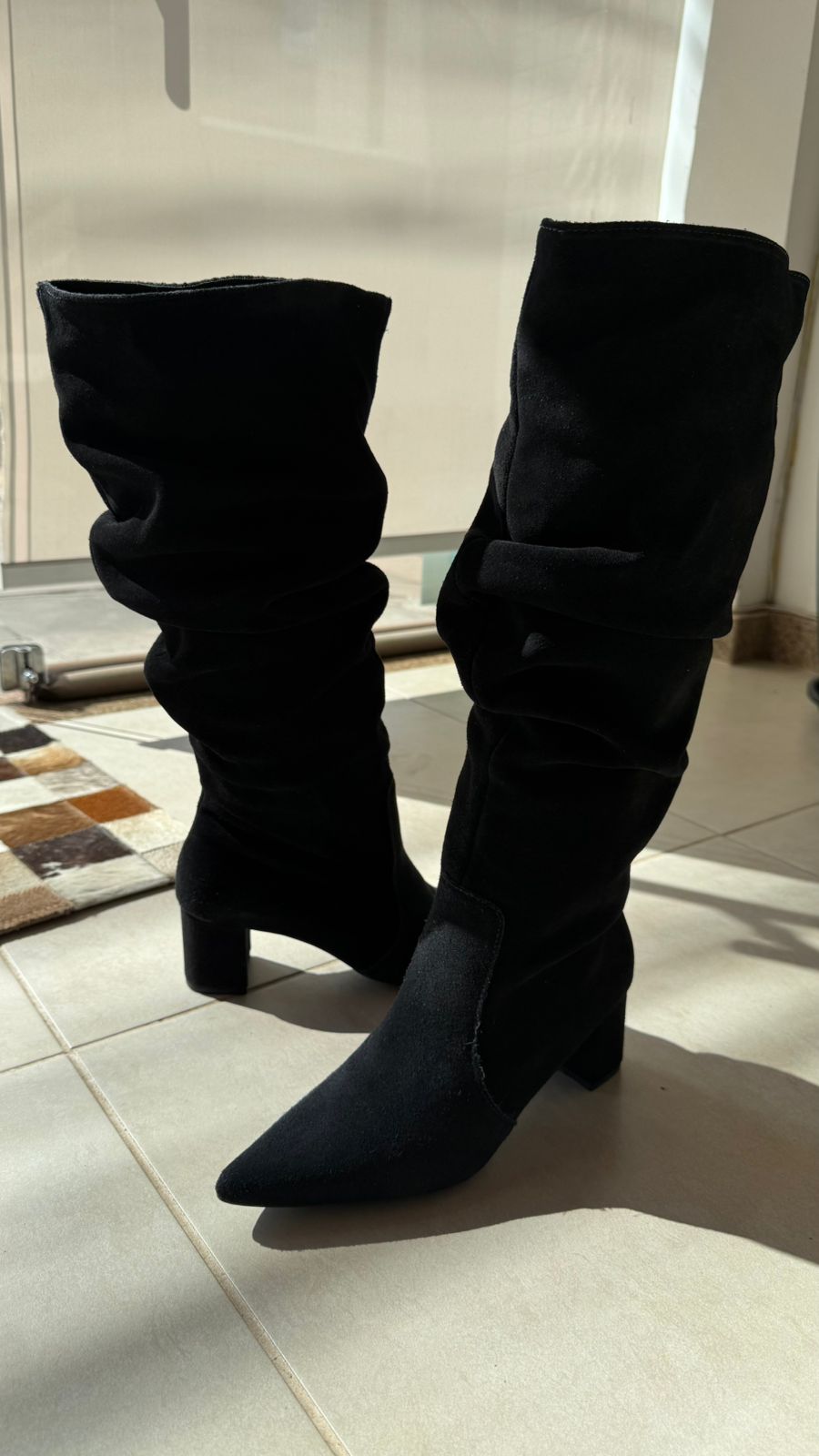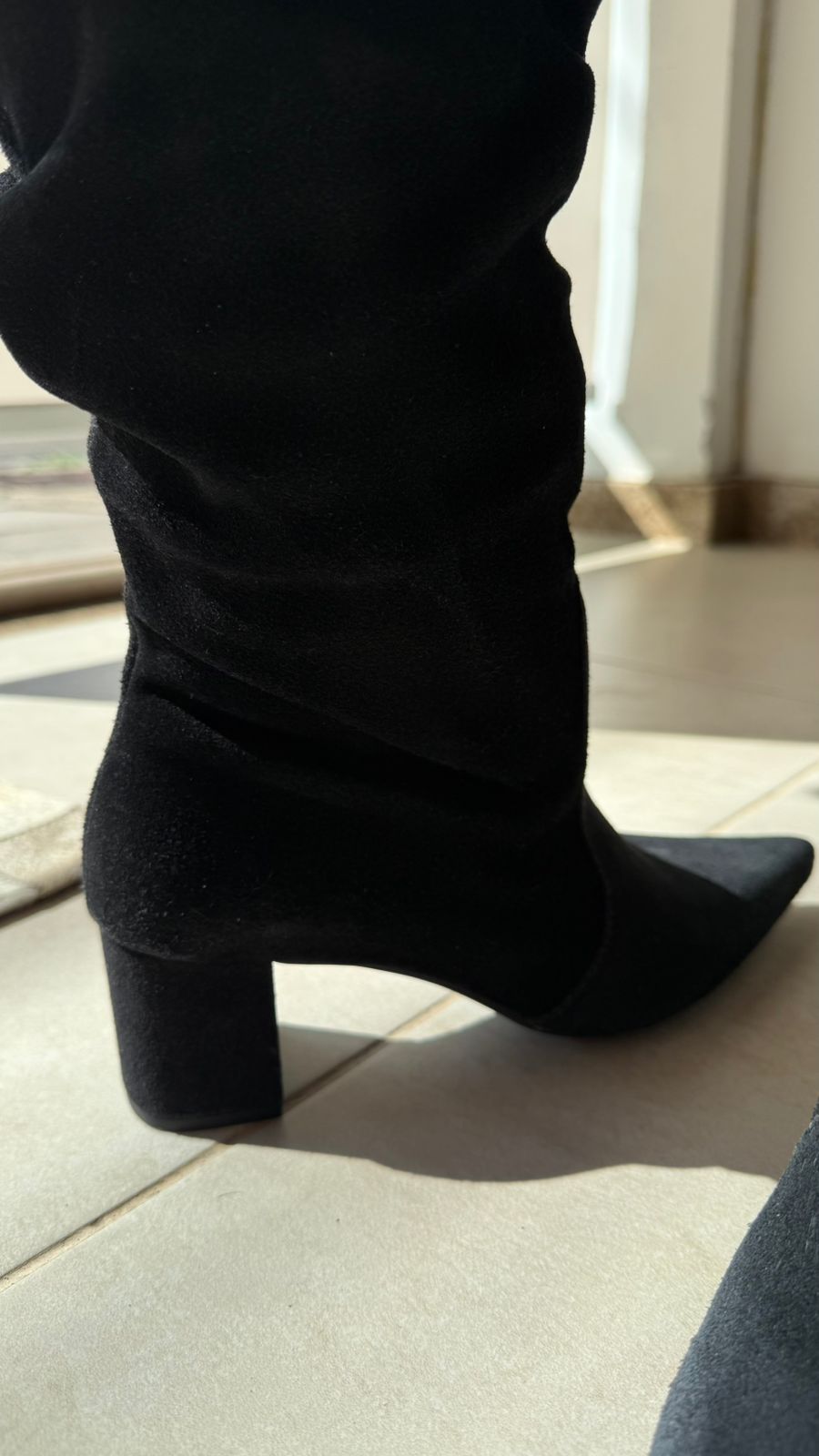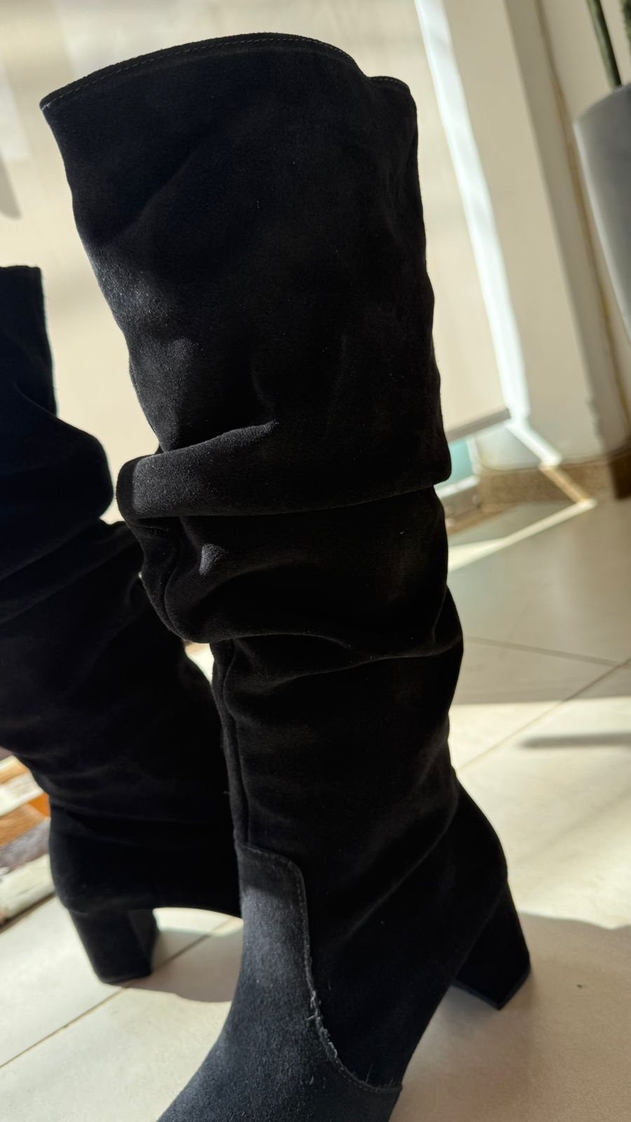 Bota em couro camurça preto, cano longo amassado, salto grosso, 5cm.