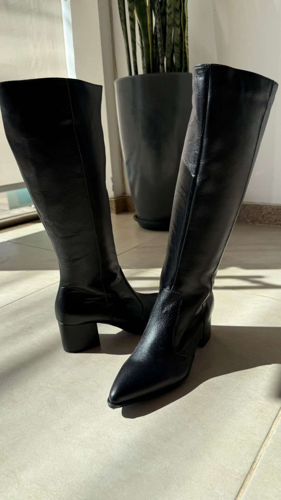 Bota em couro preto, cano longo, salto grosso 6cm.