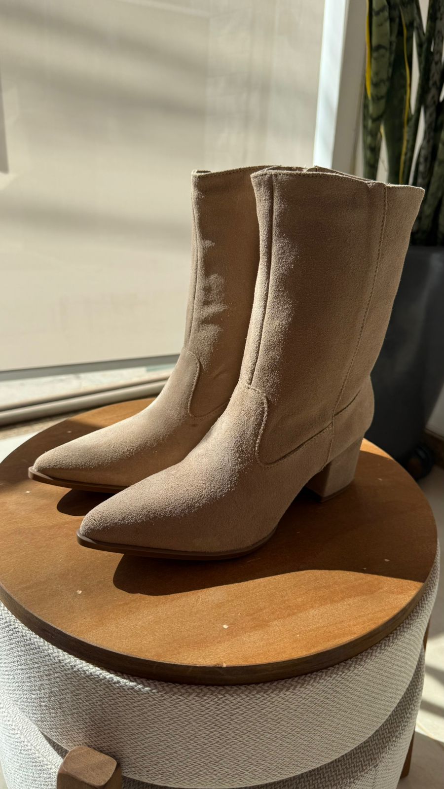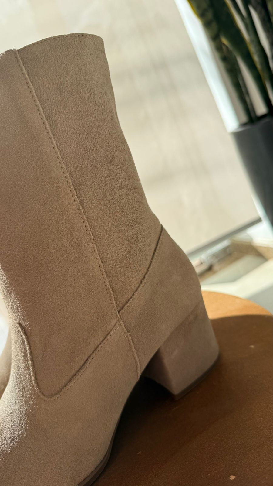 Bota em couro camurça nude, cano medio, salto groso 5cm.