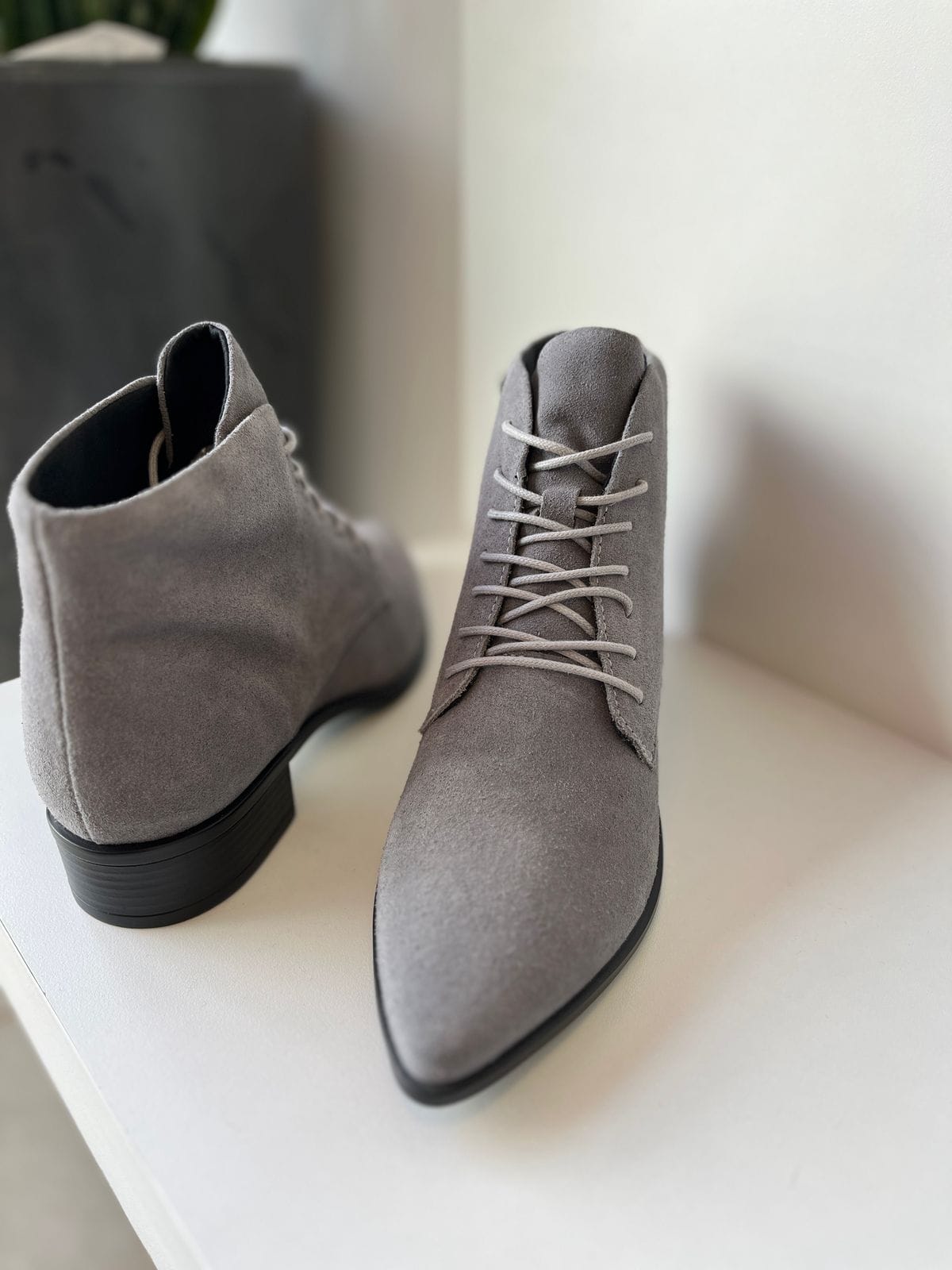 O modelo possui salto baixo, bico fino e fechamento por atacador.