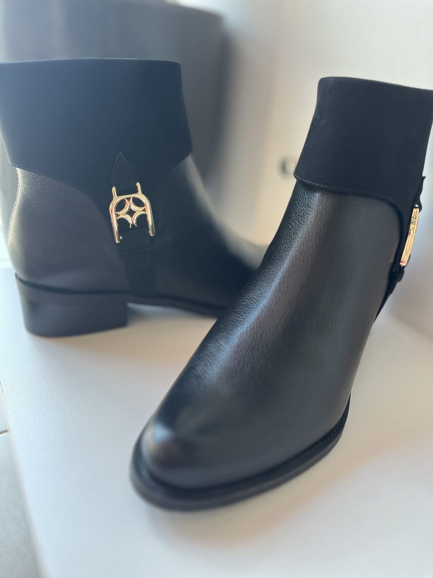 Bota estilo montaria de cano curto e cabedal em couro., Possui fechamento com zíper no lado interno e detalhe com enfeite personalizado luas no lado externo. Salto fachetado.