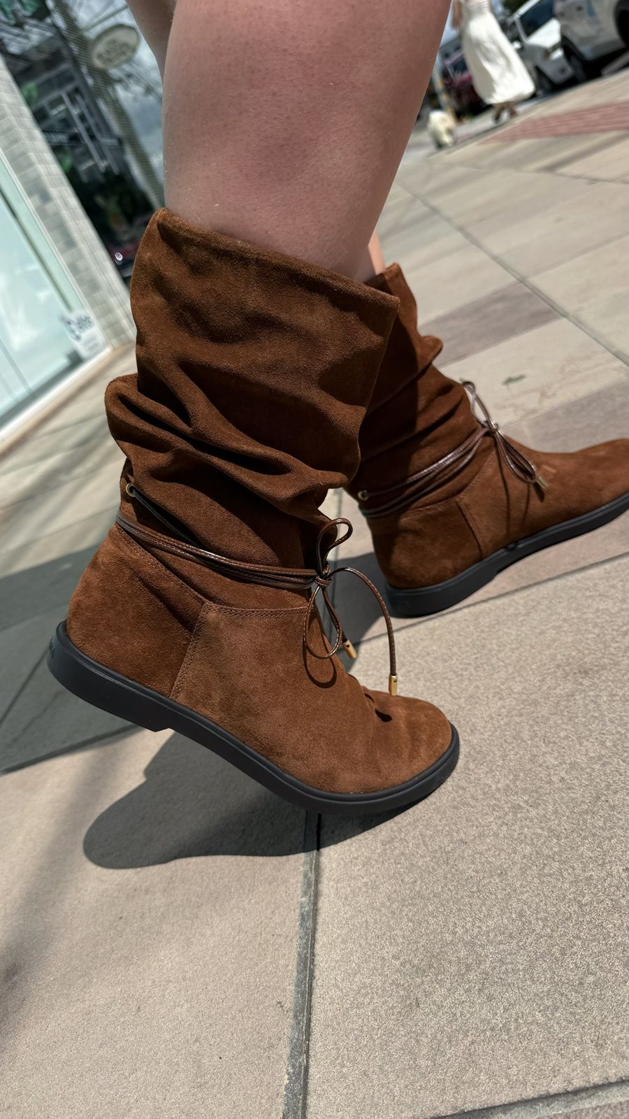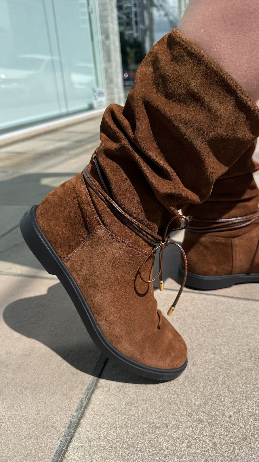 Bota em couro camurça, rasteira, com sola em E.V.A super leve.