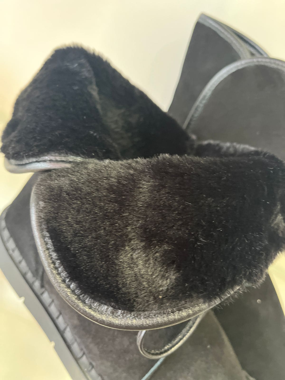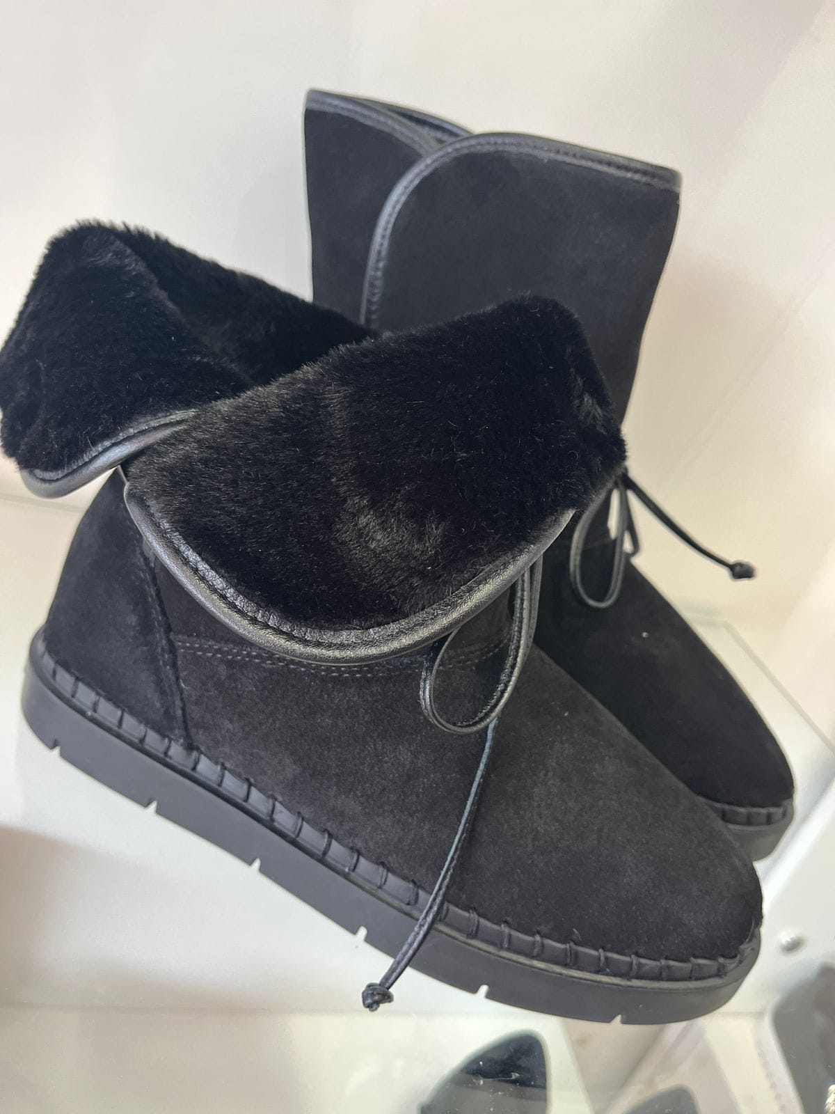 Bota em couro camurça preto, forrada internamente, com cabedal em couro e cano baixo. Possui metal delicado na lateral externa e amarração com couro no cano.