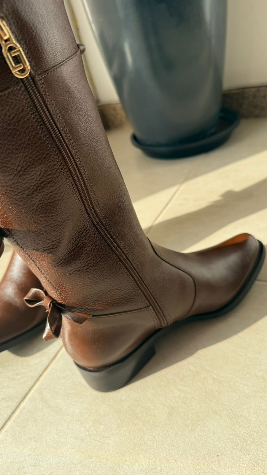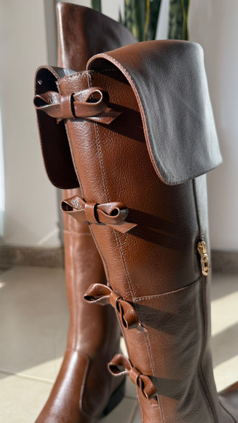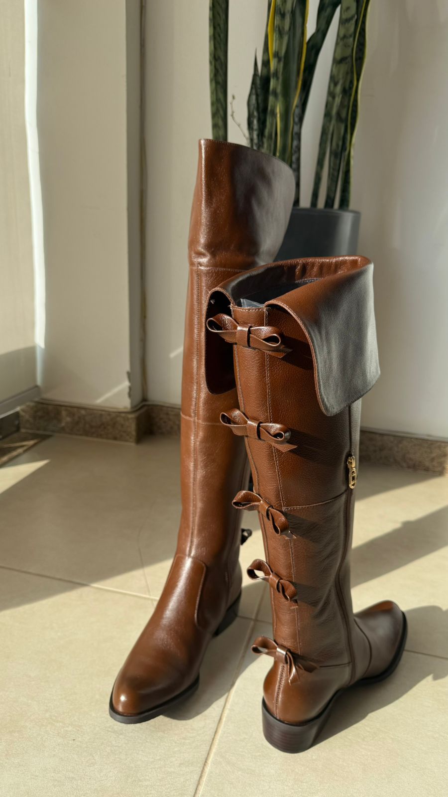 Bota over the knee, em couro marrom, com detalhes na parte de trás em lacinhos.