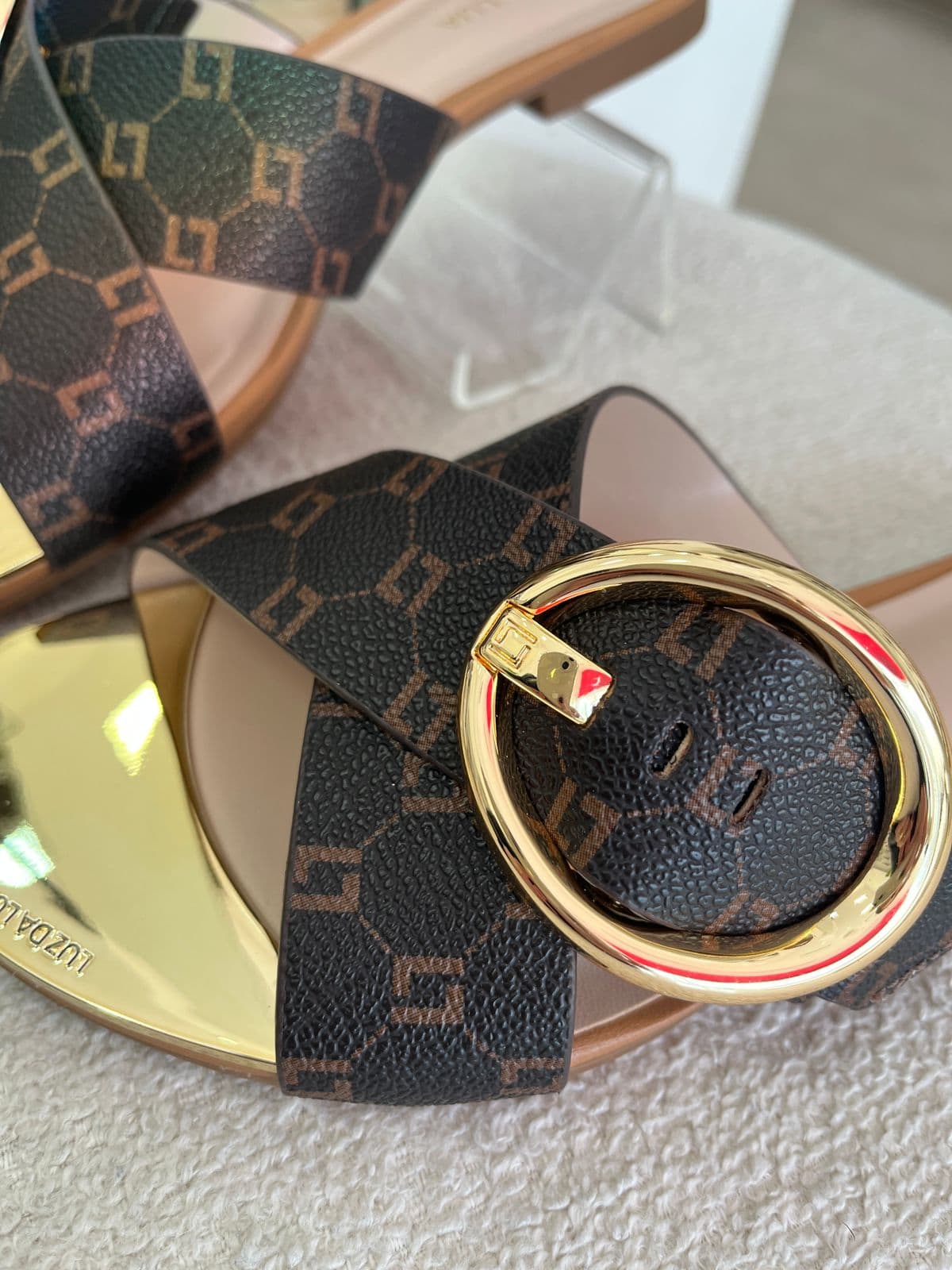 Chinelo em tiras largas, monograma, com metal frontal na sola.