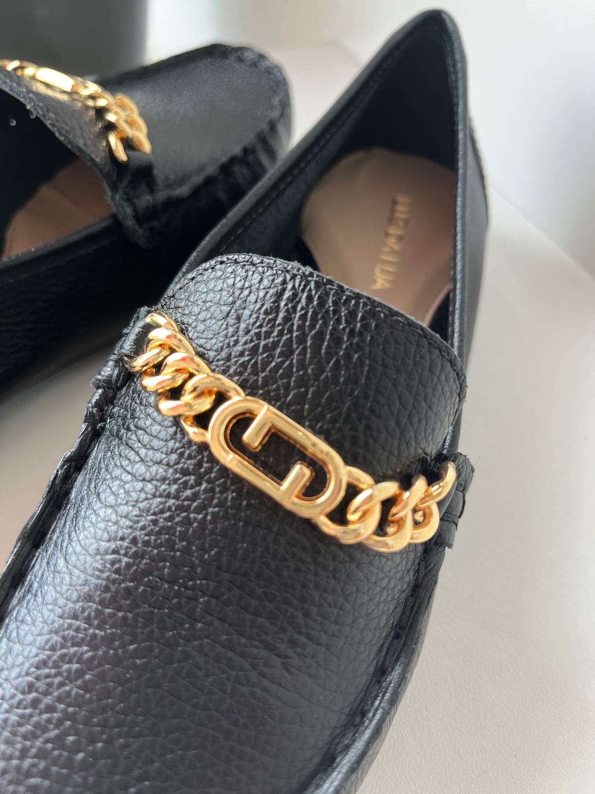 Mocassim Luz da Lua, em couro preto, com corrente na parte superior.