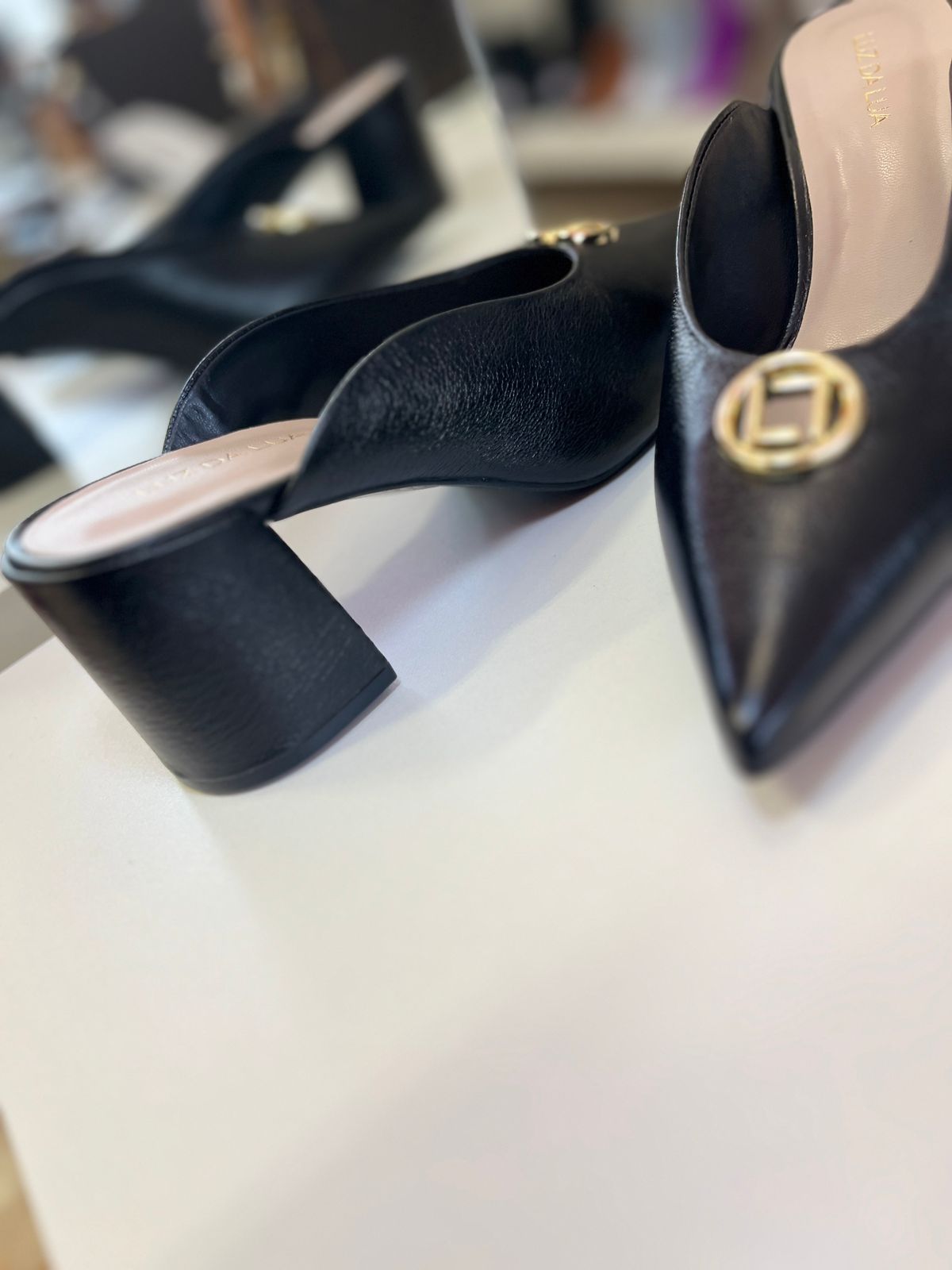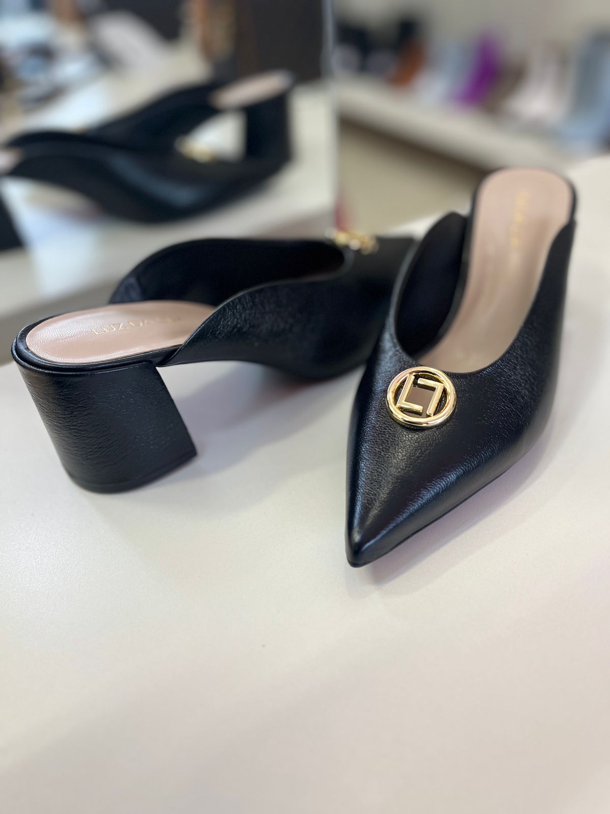 Mule, em couro preto, com detalhe dourado na parte superior do pé, salto grosso, 5cm.