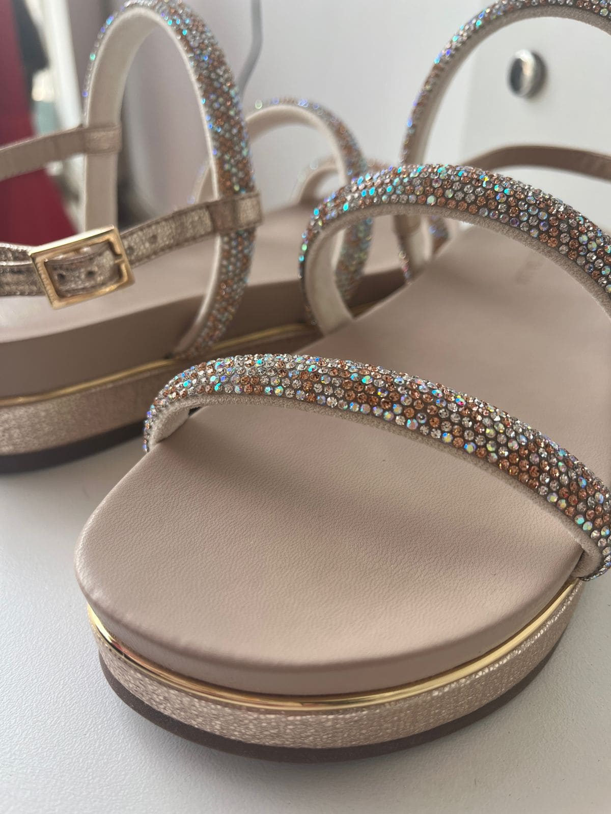 Rasteira em couro, na cor Ouro Vênus. O modelo tem salto baixo flatform em couro. Possui bico arredondado, tiras finas com aplicação de cristais sobre os dedos e peito do pé. Trás tira final na cor Gold em torno do tornozelo, com fechamento em fivela dourada.