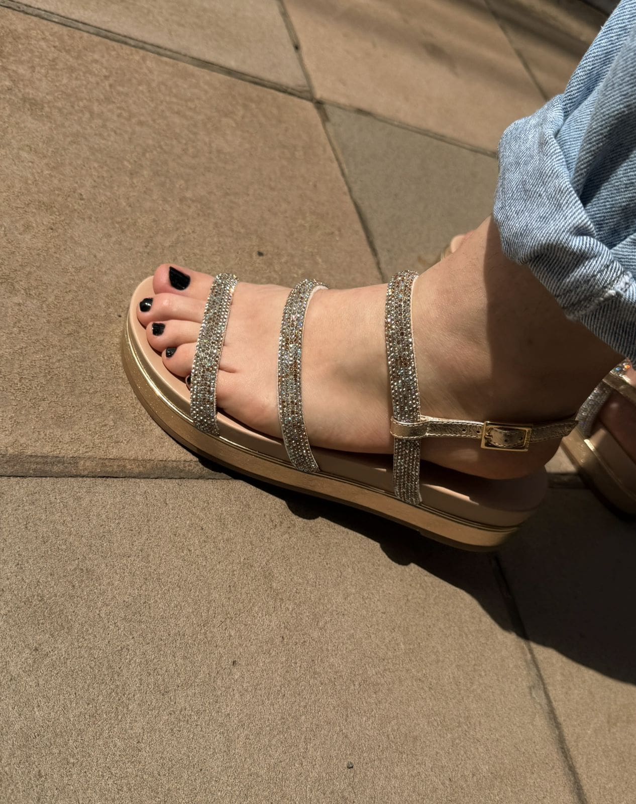Papete com detalhe em couro dourado na sola, com três tiras cravejadas em brilho, e regulagem para melhor calce.