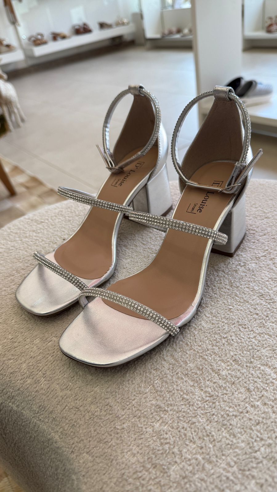 Sandália prata com três tiras em brilho, salto grosso, 6cm.