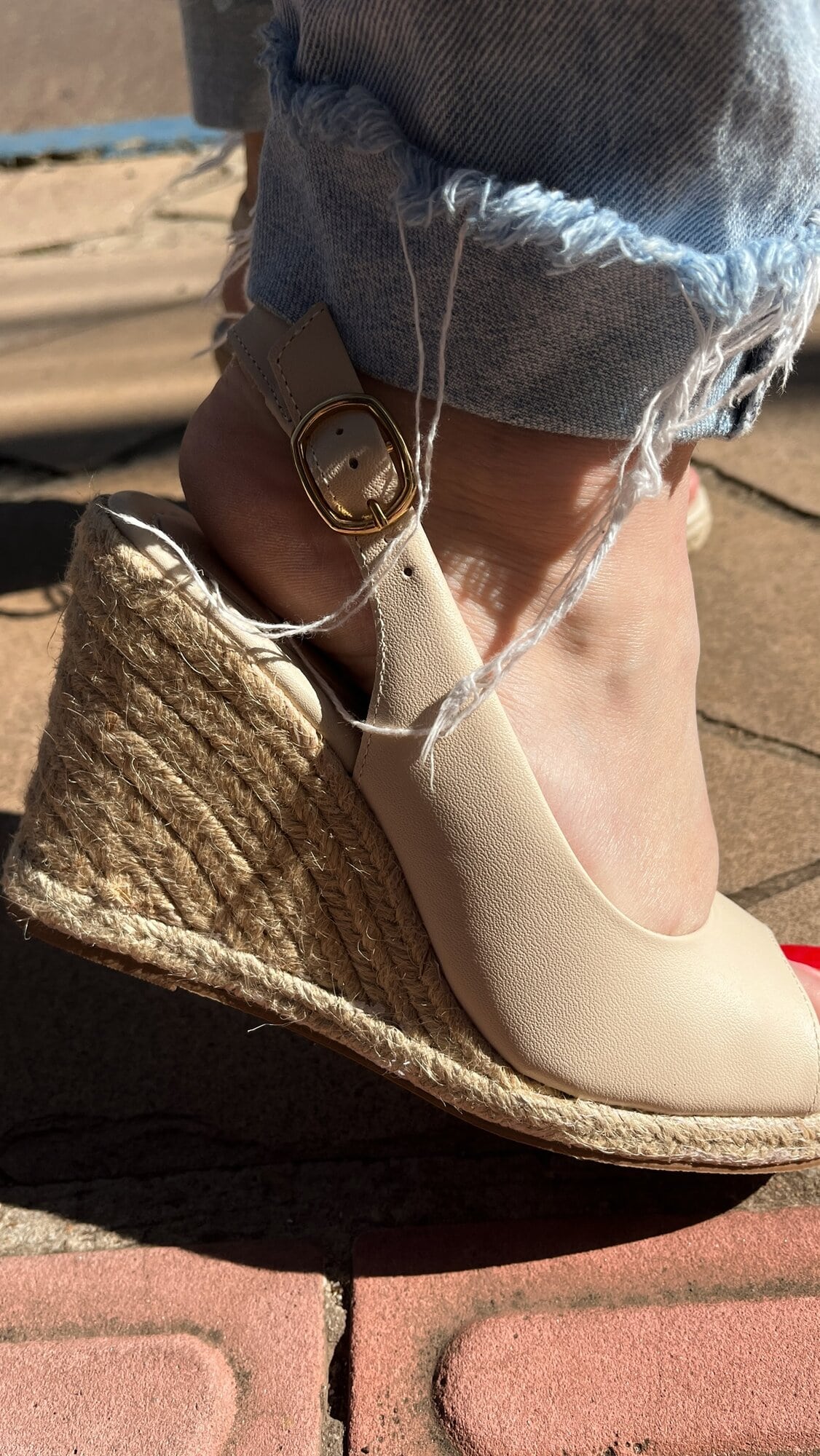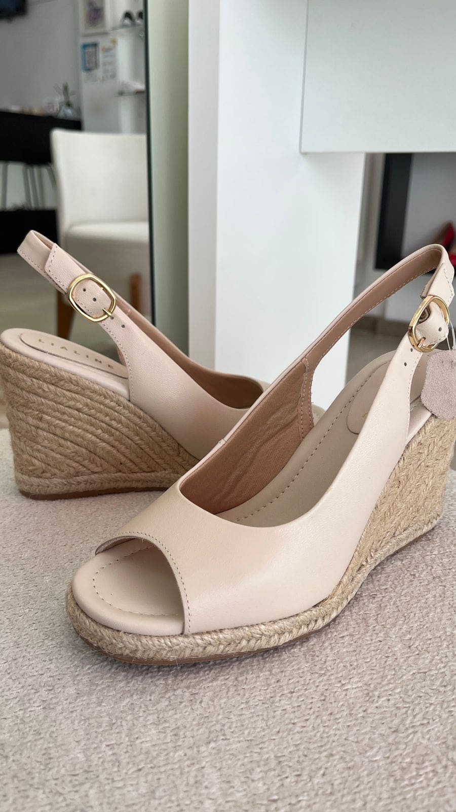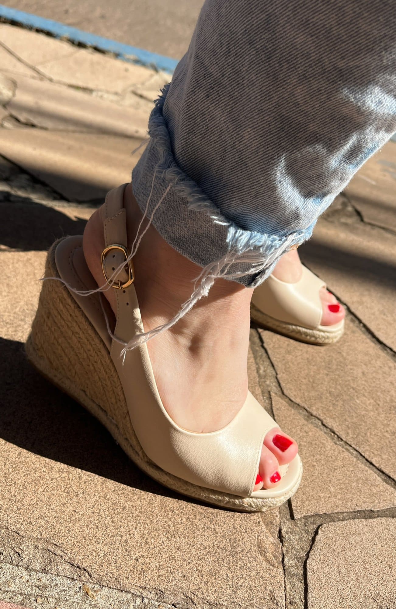 Sandália anabela, em couro off white, com salto em corda, 10cm.
