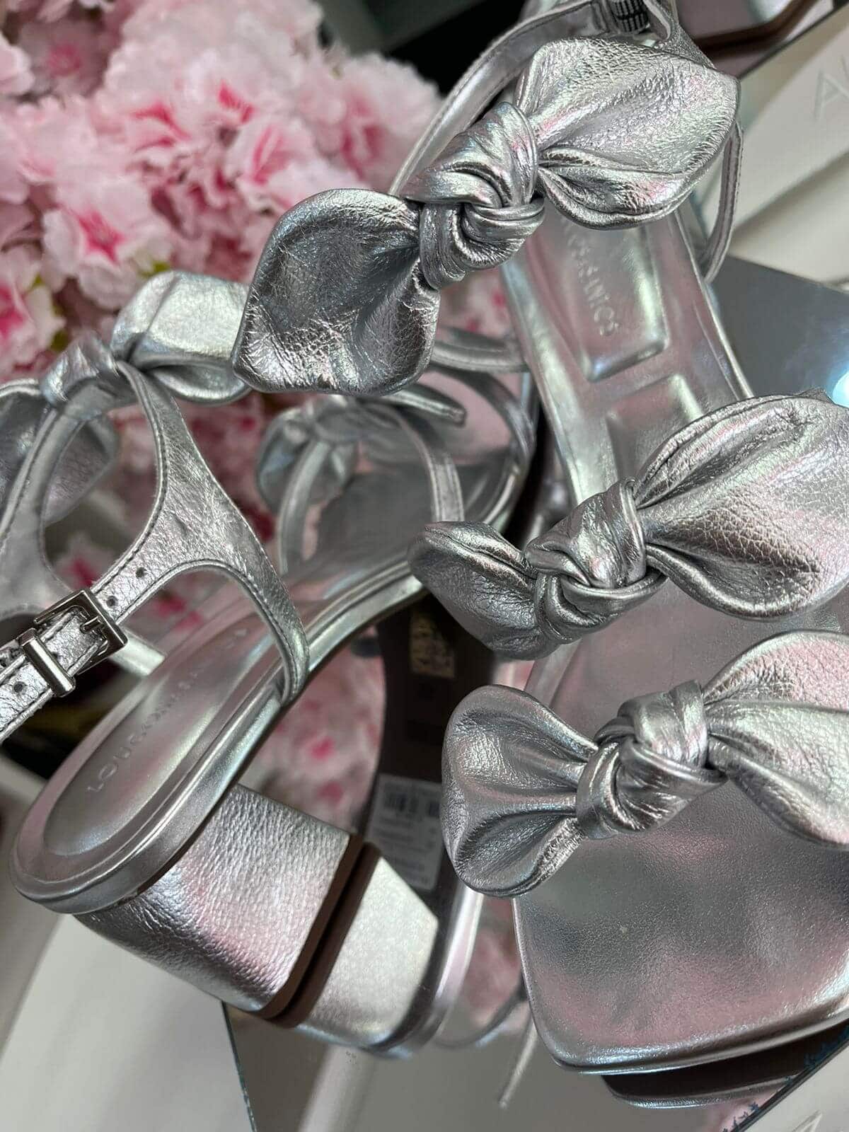 Sandália em couro prata, com laços sobrepostos nas tiras. Salto 4cm