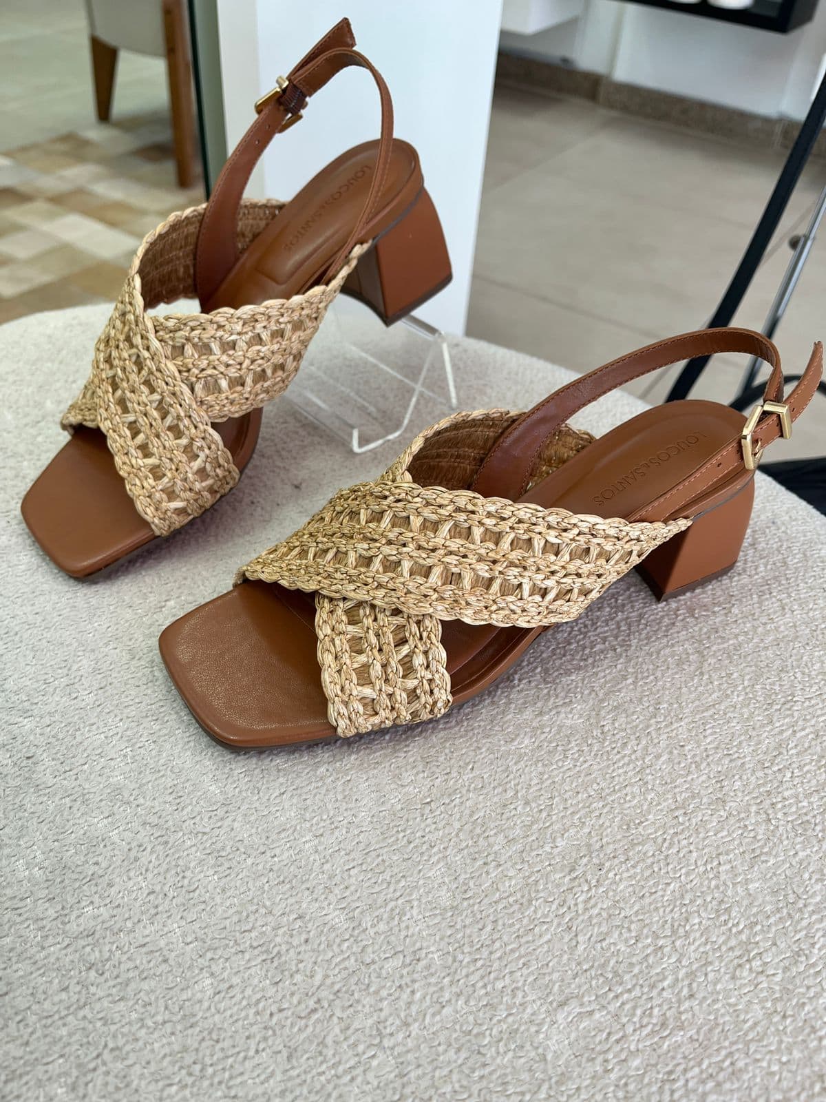Sandália com tiras em x, material palha, com salto bloco, grosso, em couro caramelo, 5cm.