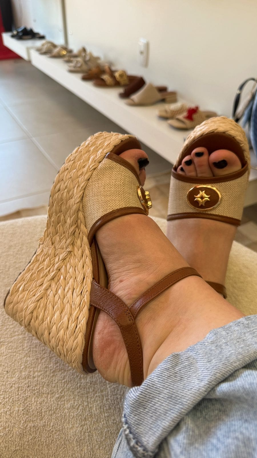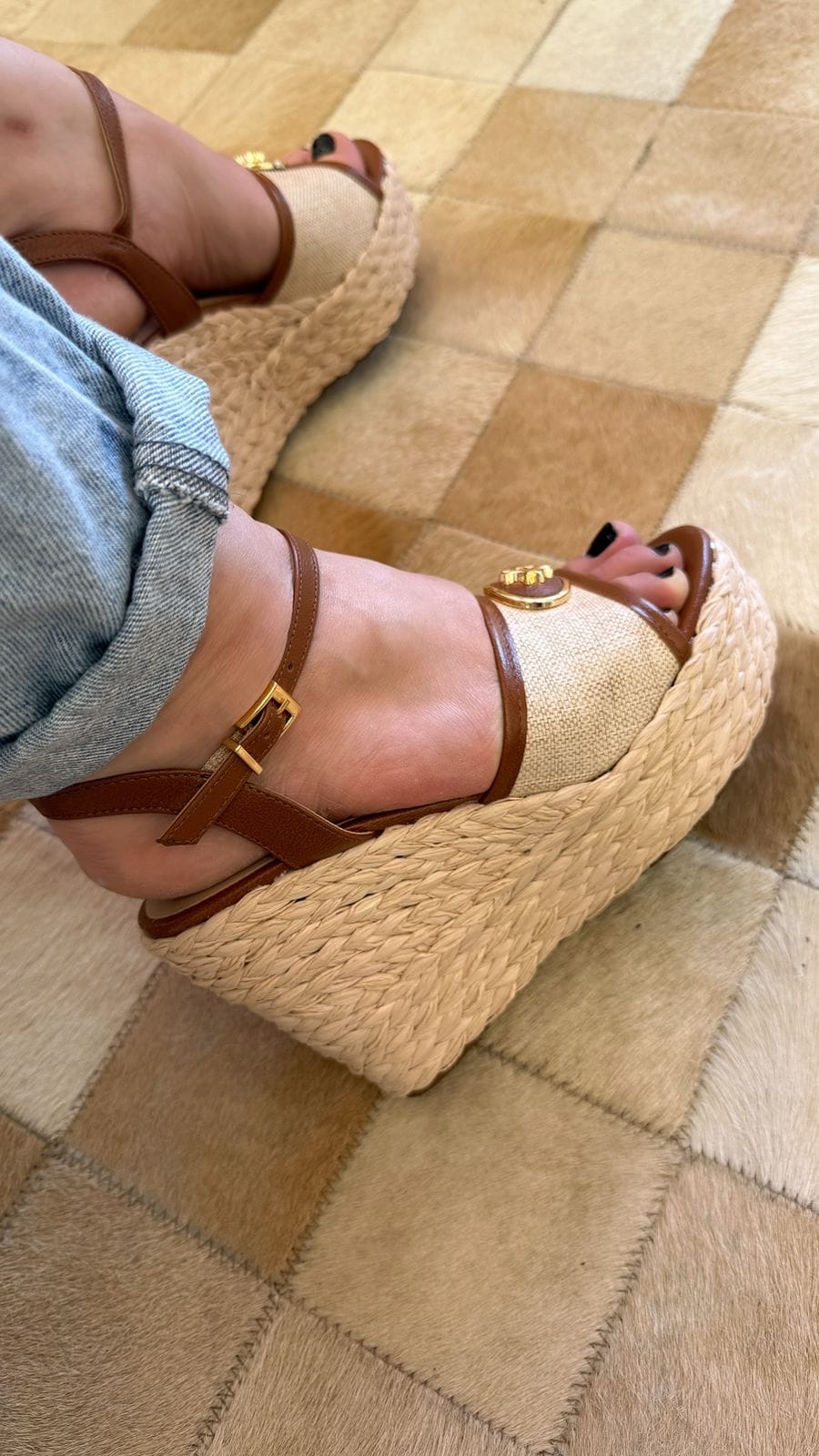Sandália plataforma, em couro caramelo, com linho, e palha.