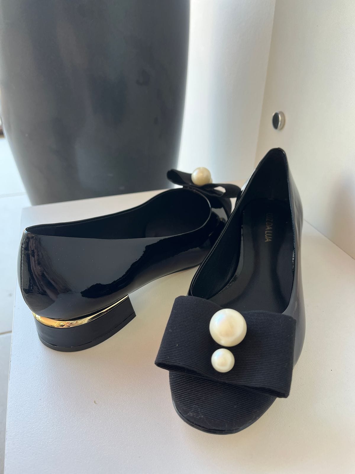 Sapatilha com cabedal em couro verniz, possui biqueira e laço em tecido. Laço com aplicação de pérolas. Salto forrado em couro com detalhe cromado na parte superior.