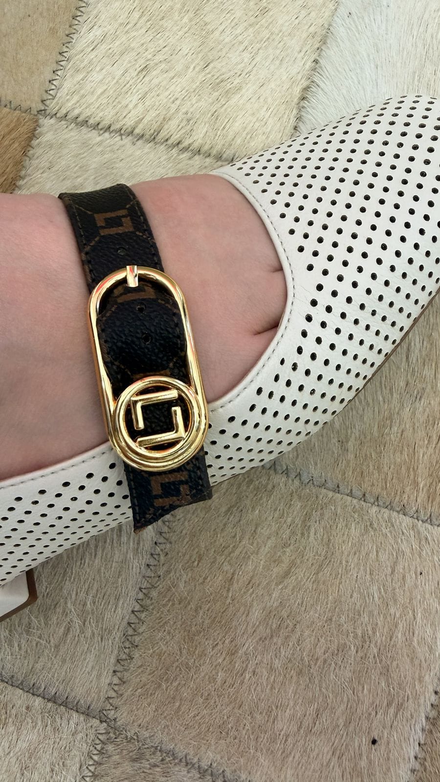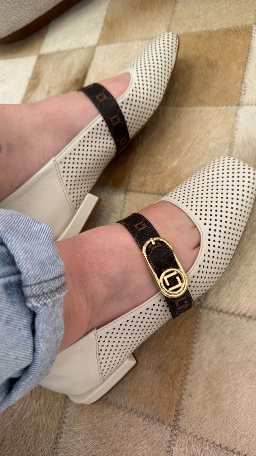 Sapatilha em couro off white, com tira na parte superior do pé, em monograma.