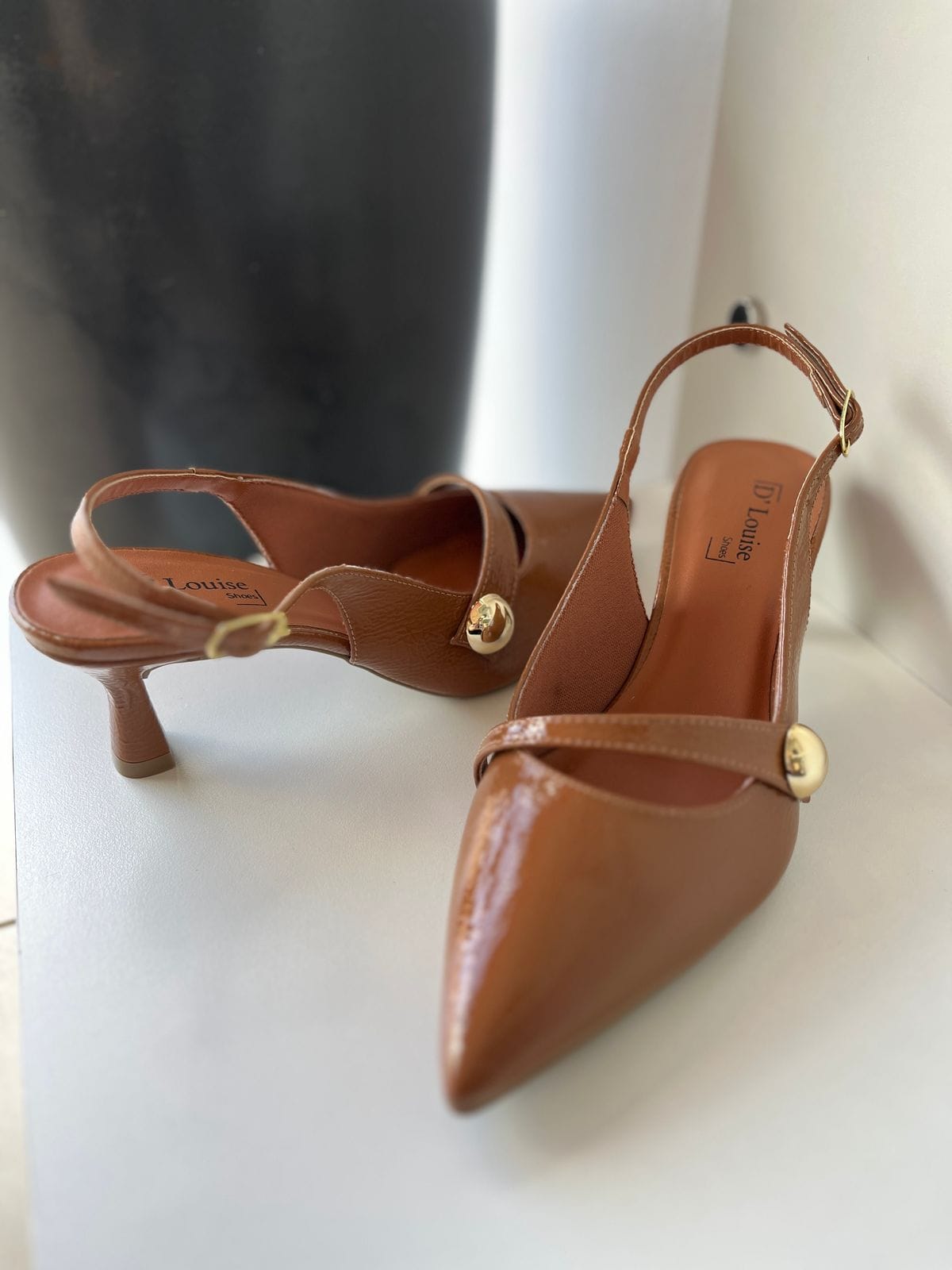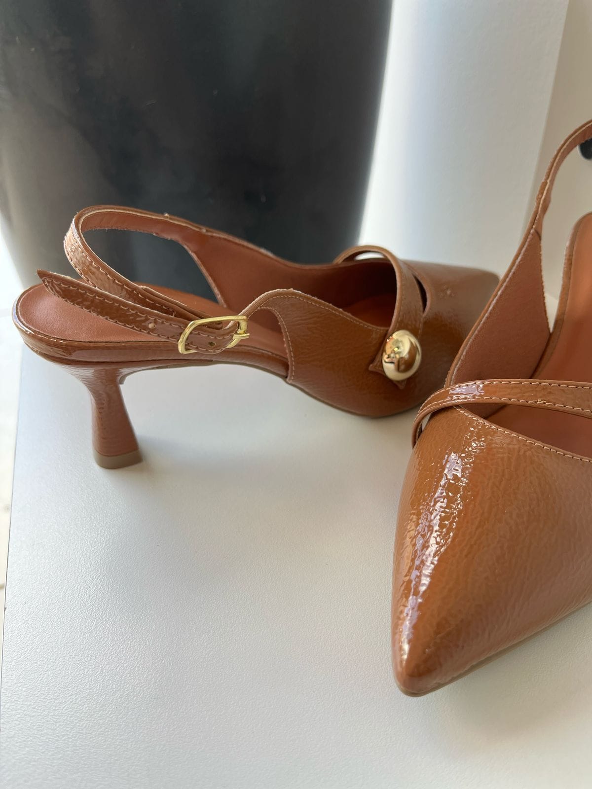 Slingback em verniz caramelo, com fivela para melhor ajuste, e salto 4cm
