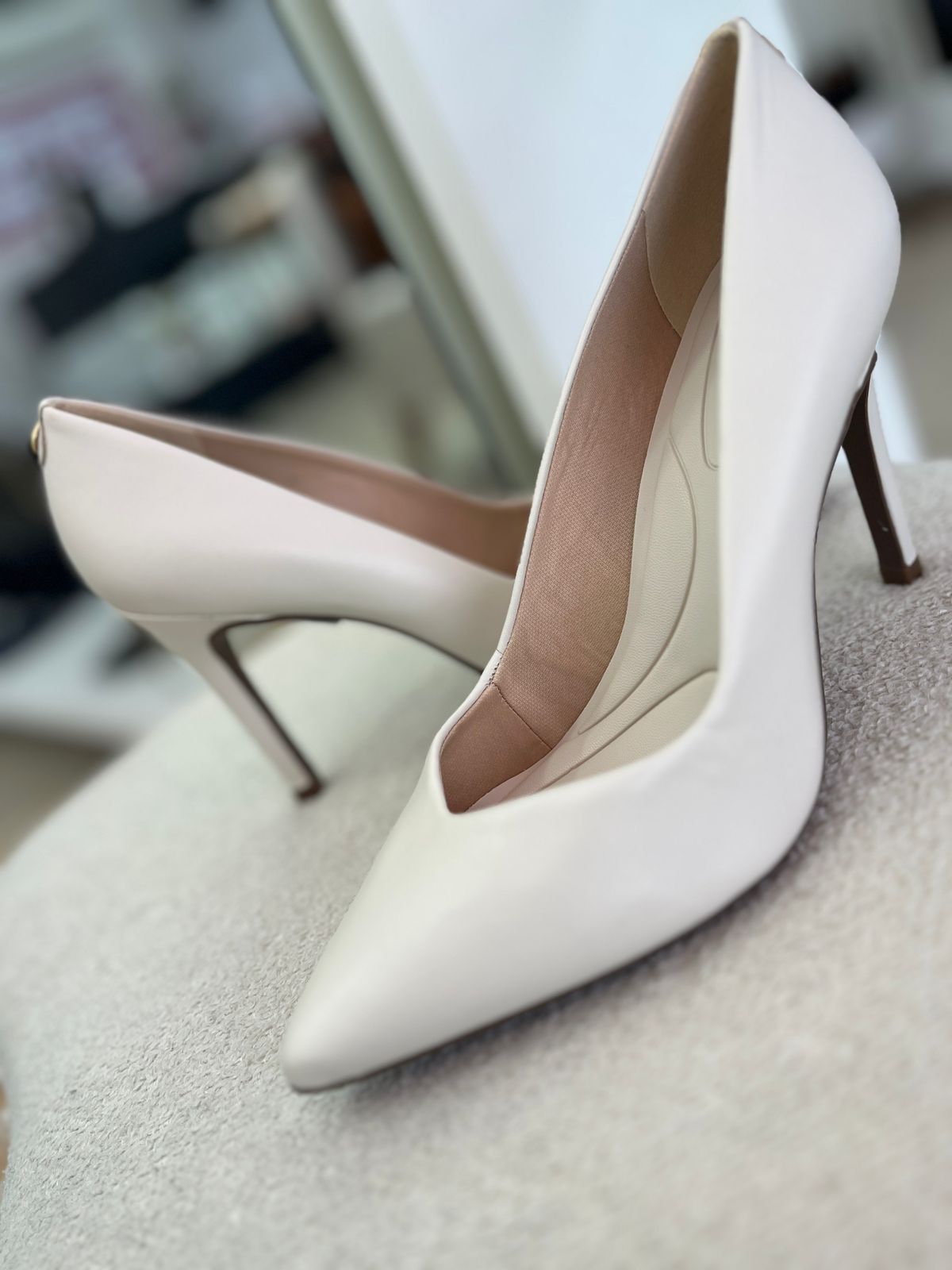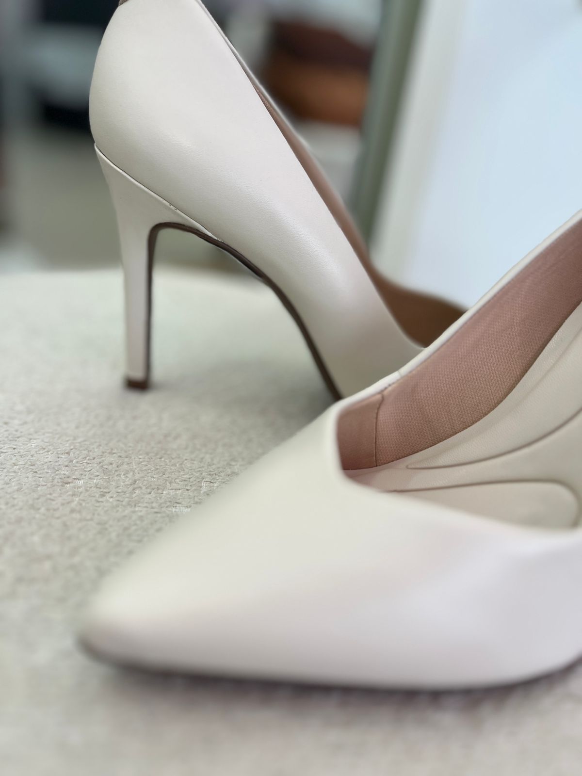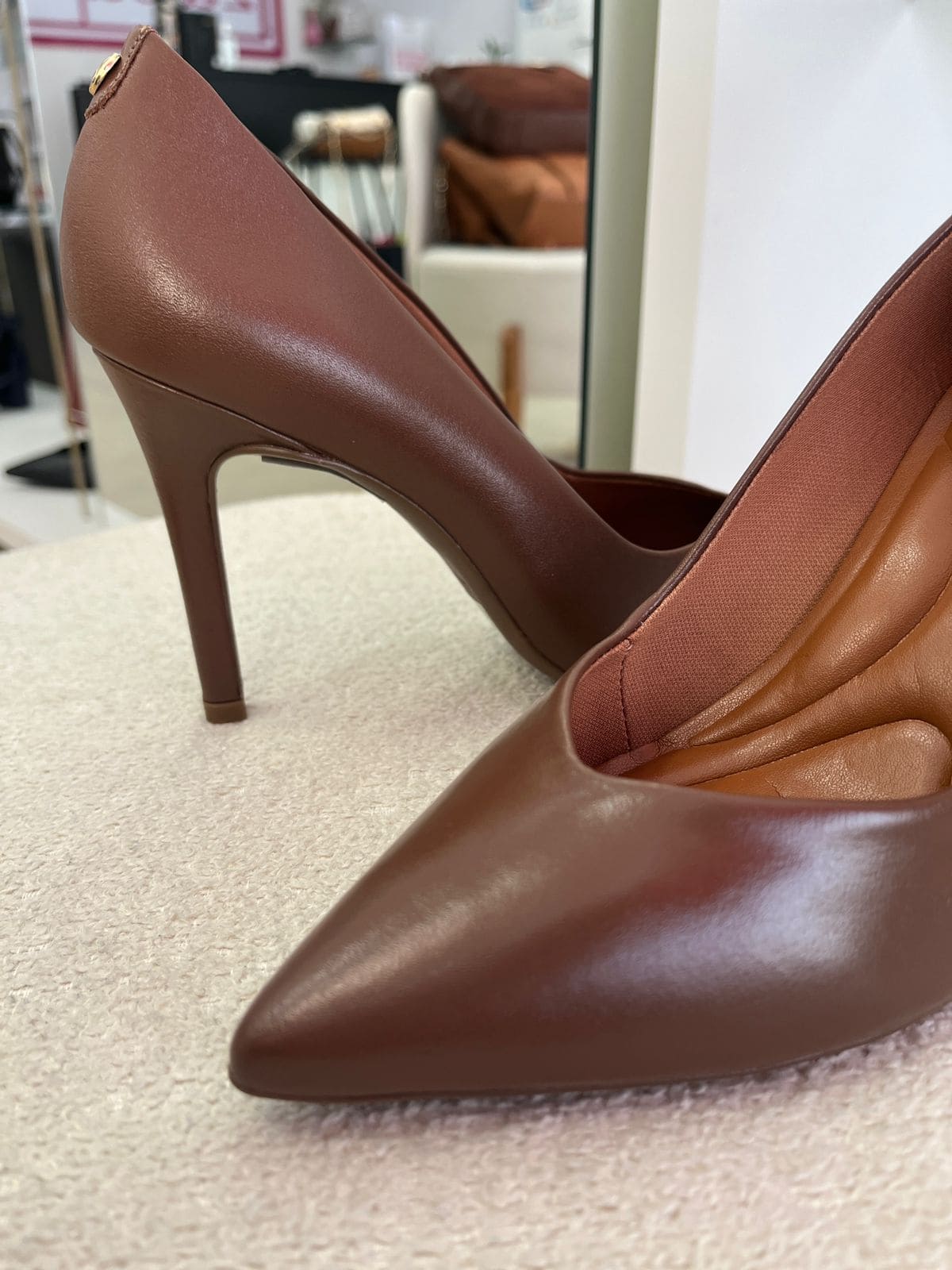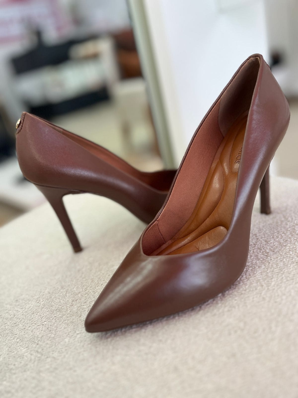 Scarpin com acabamento em couro na cor Marrom e Off White. O modelo possui recorte em V sobre o pé, bico fino e palmilha acolchoada, salto fino 9,5cm.