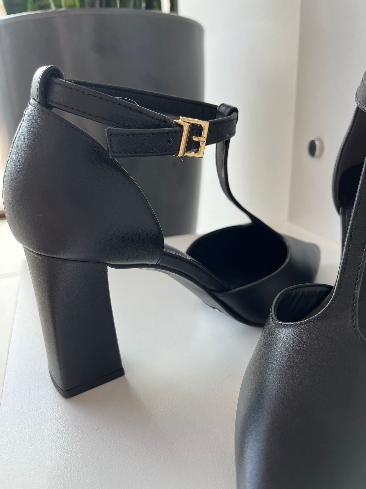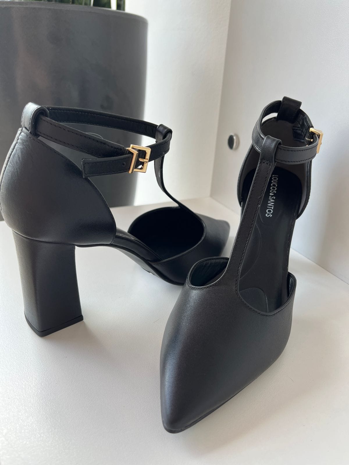 Sapato em couro preto, salto grosso 8cm.