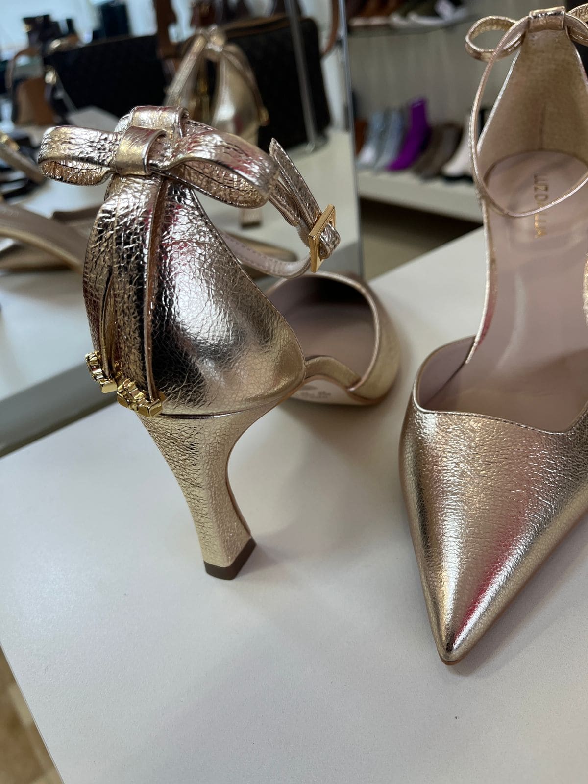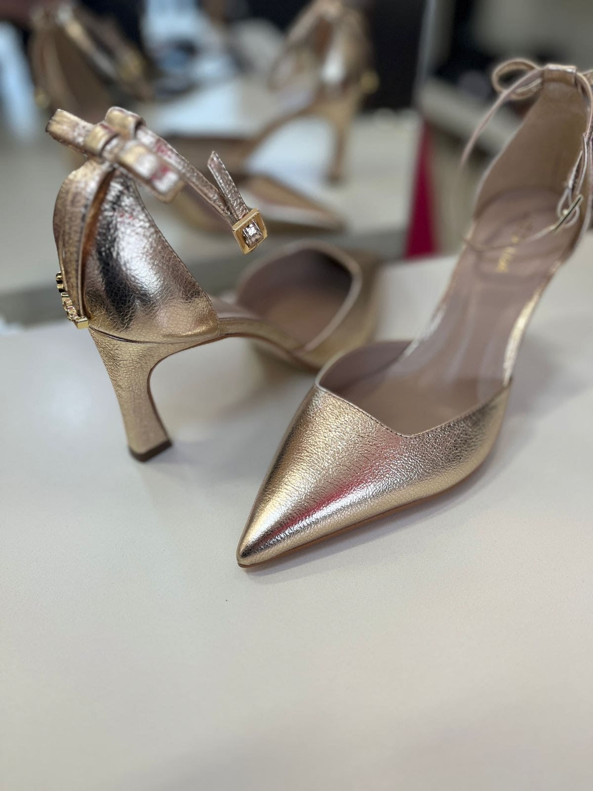 Sapato em couro, dourado, com pulseira no tornozelo, e detalhe em laço na parte traseira do sapato, salto fino, 7cm