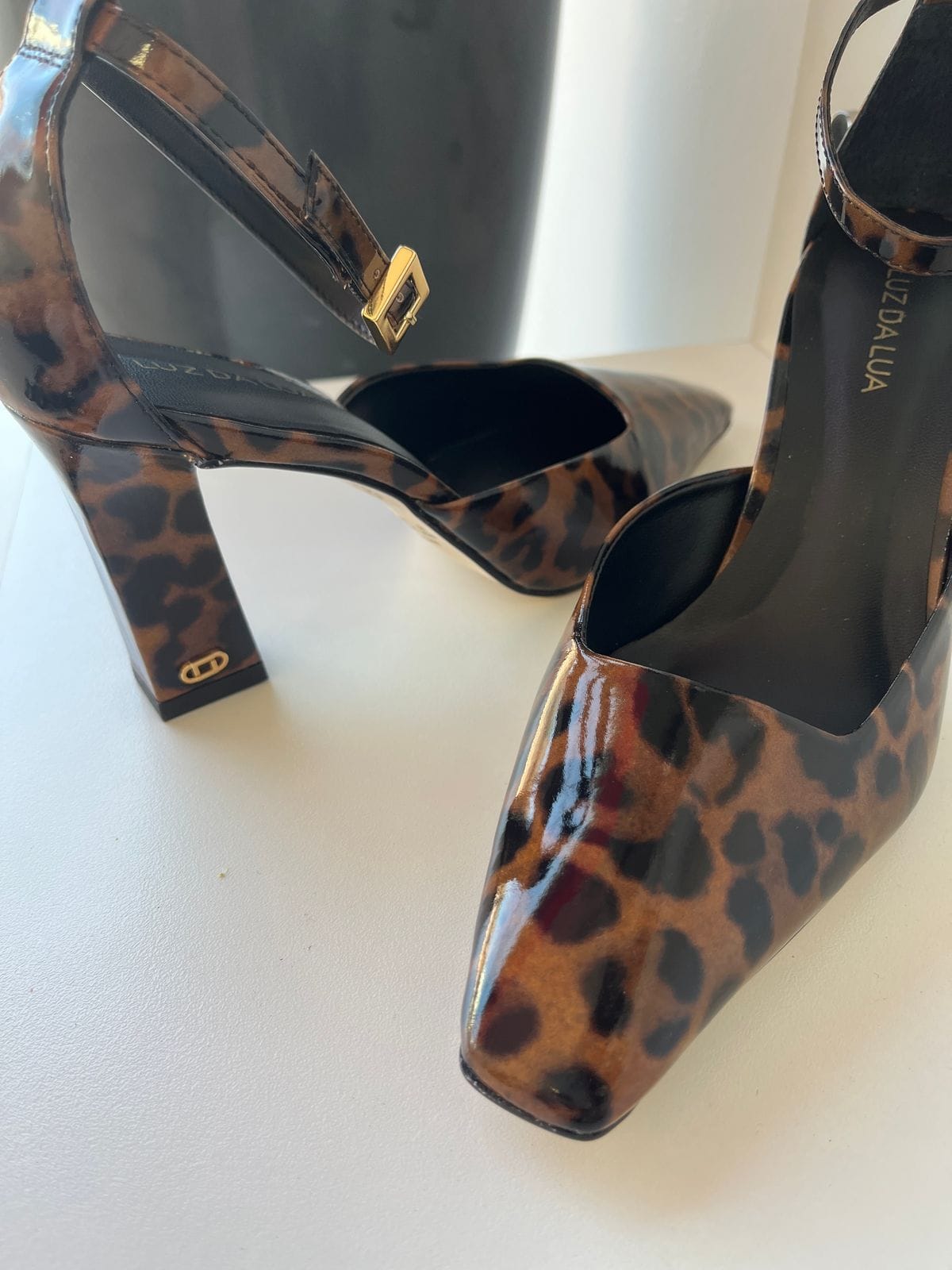 Scarpin com cabedal em verniz couro animal print. Traseiro fechado com fechamento de fivela no tornozelo. Salto forrado em couro com aplicação de metal delicado.