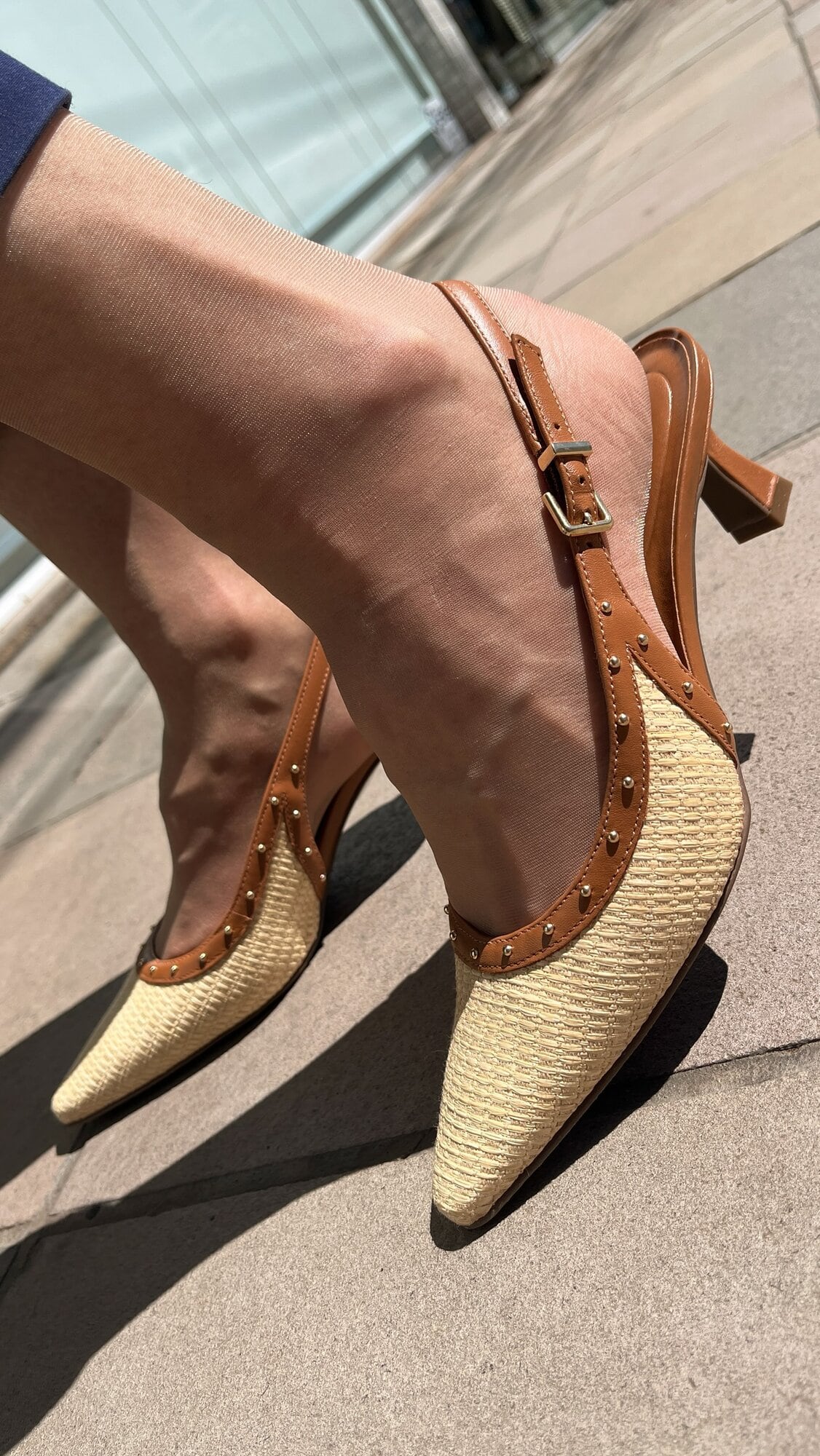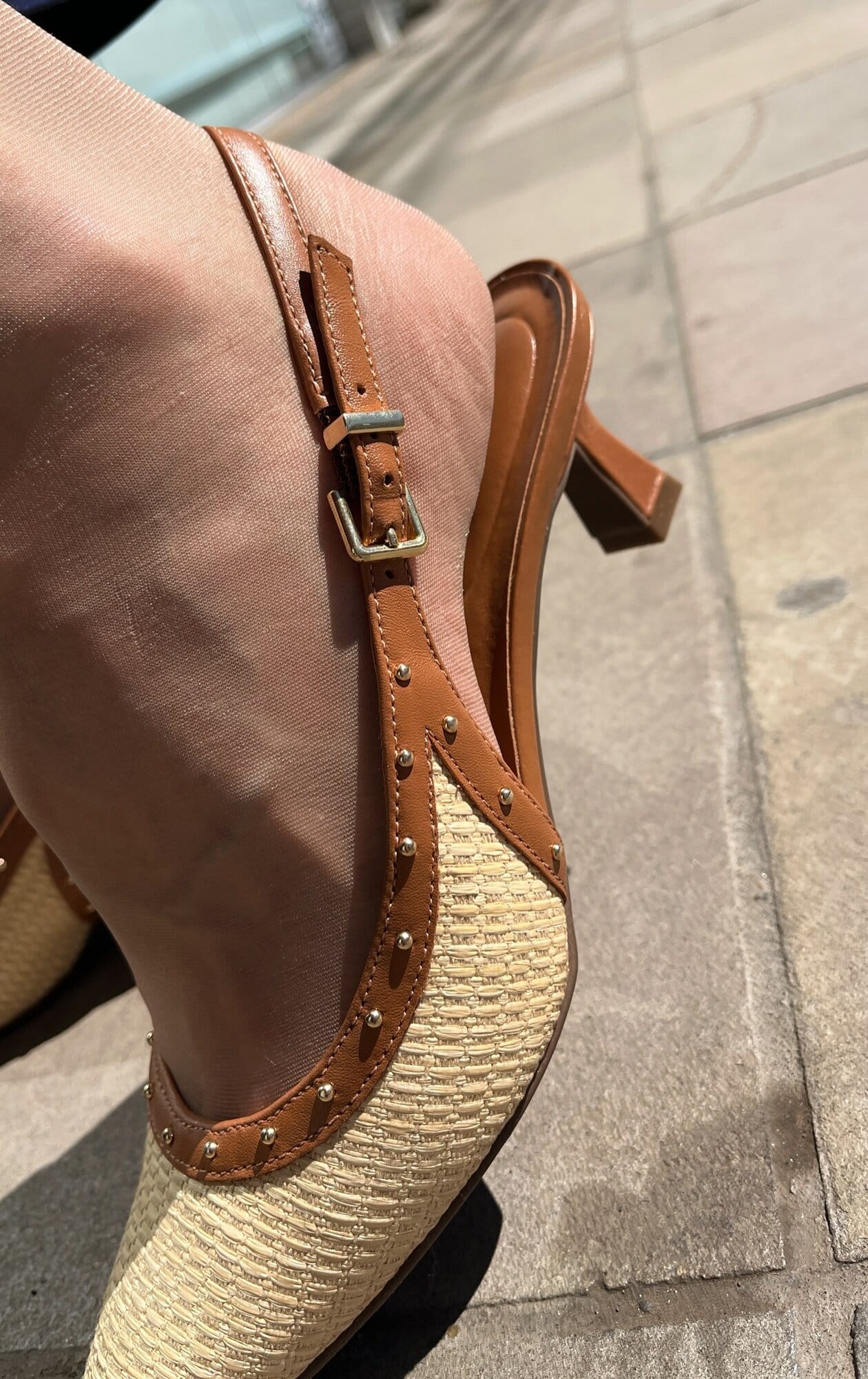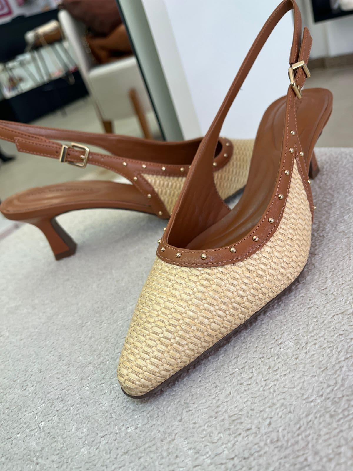 Slingback com acabamento em palha e couro.