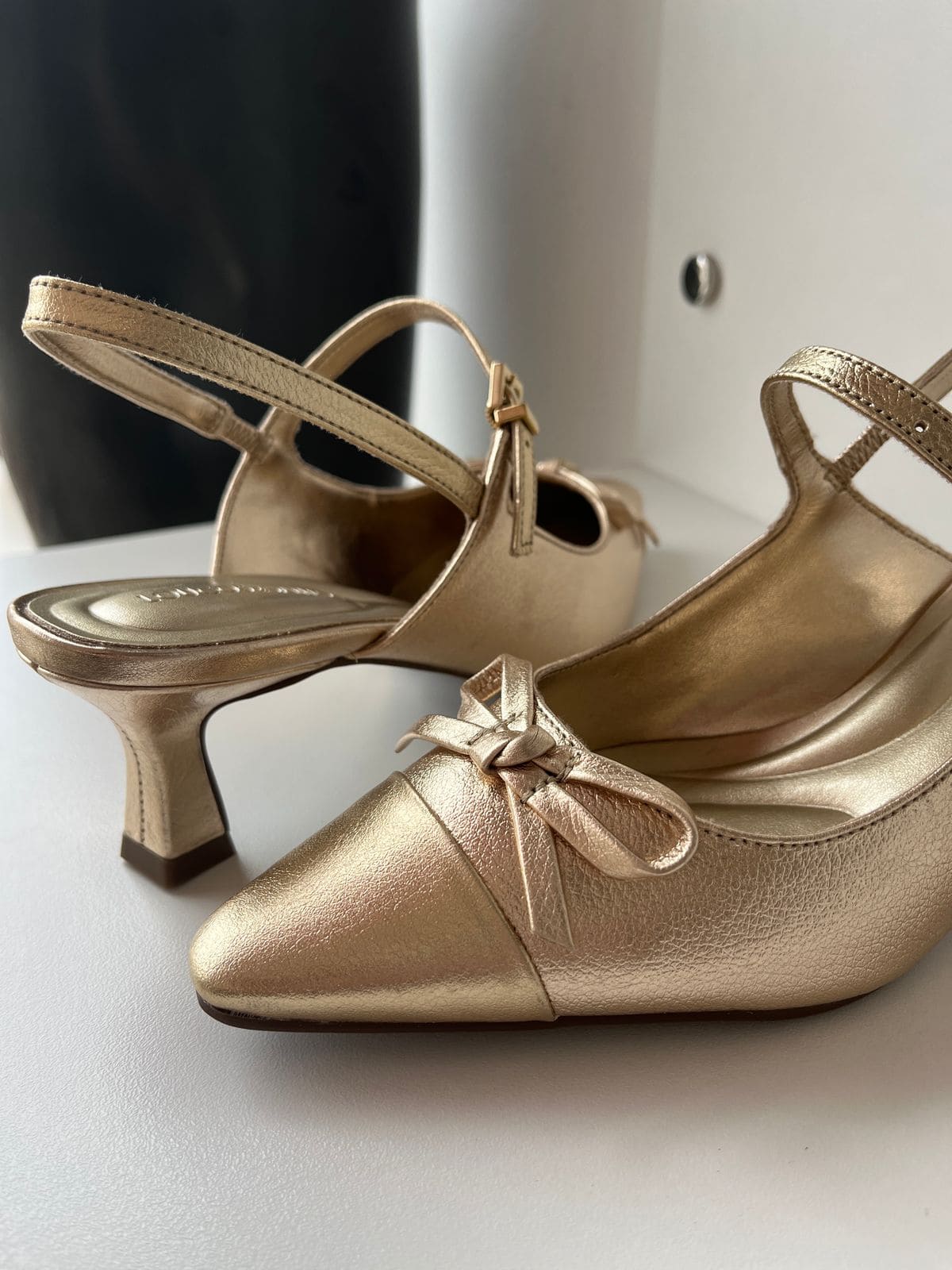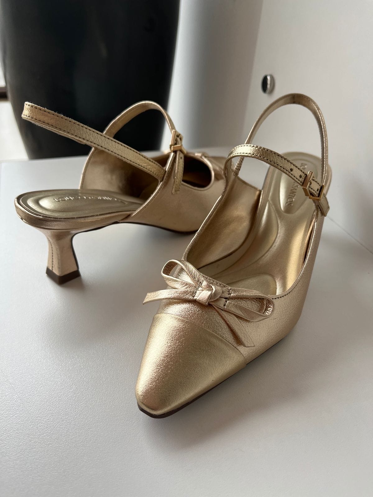 Slingback Loucos e Santos, em couro na cor ouro, com detalhe em laço, salto 5,5cm
