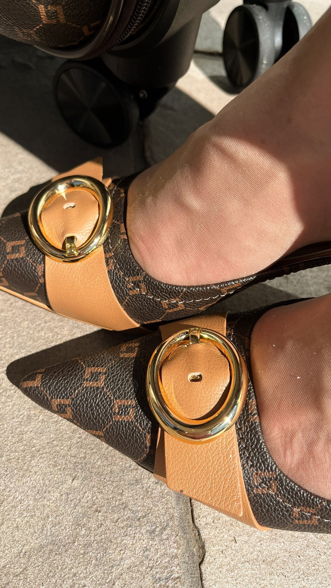 A elegância moderna do slinkgback com salto taça, 6,5cm e fivela marcante, em monograma, é o toque que vai iluminar seus looks.