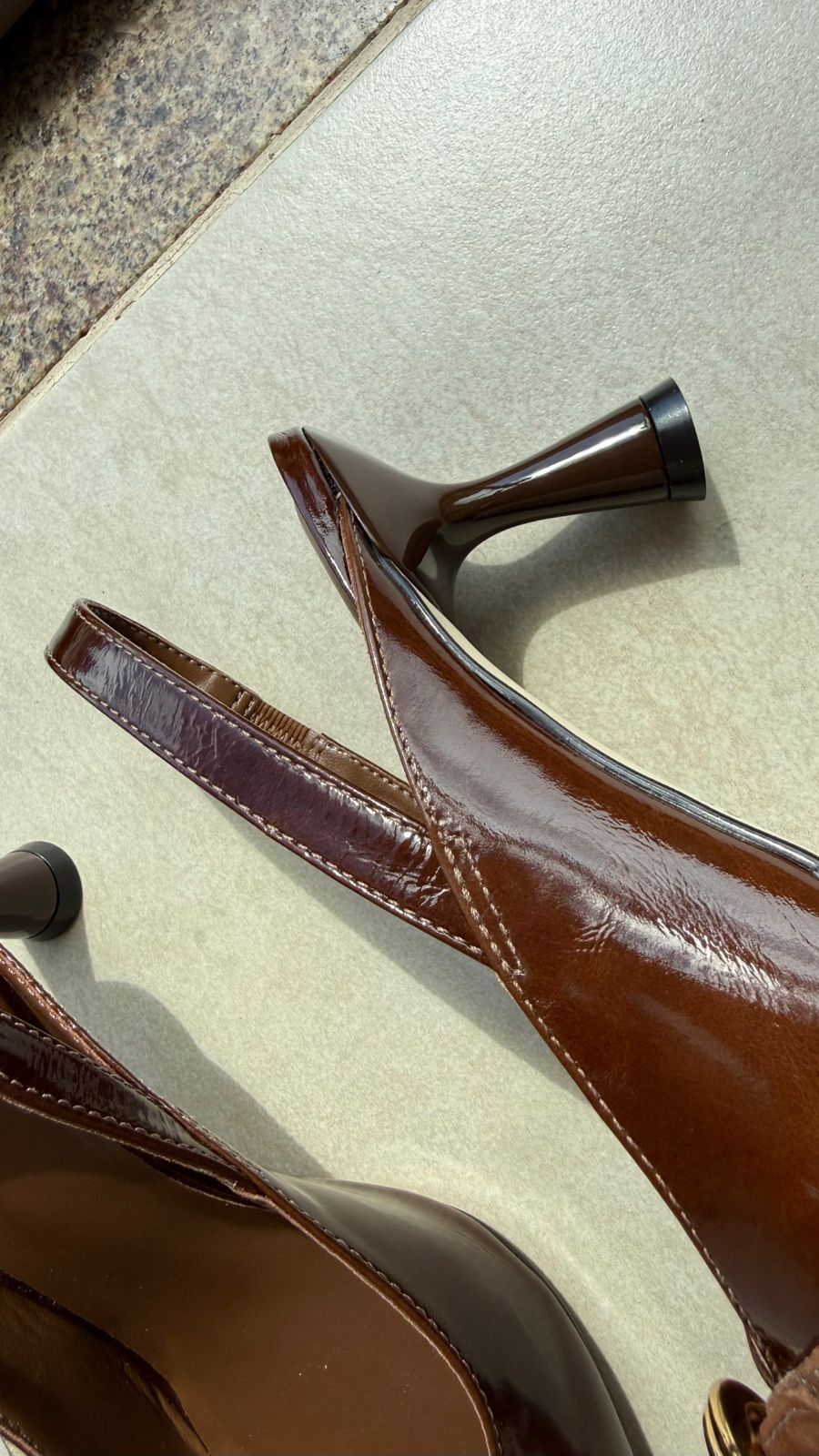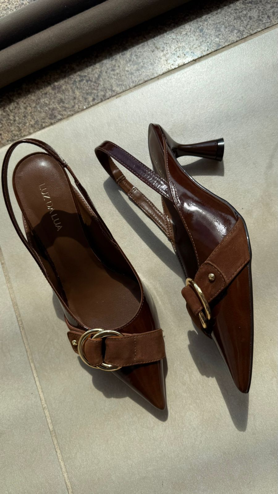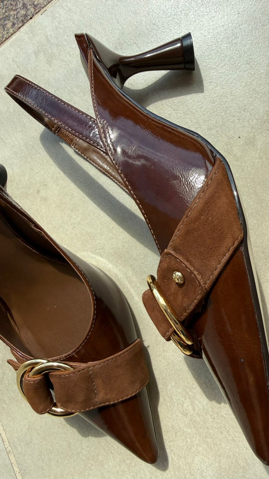 Slingback em couro verniz murano marrom, com detalhe em camurça marrom na parte superior do pé. Salto fino, 7cm.