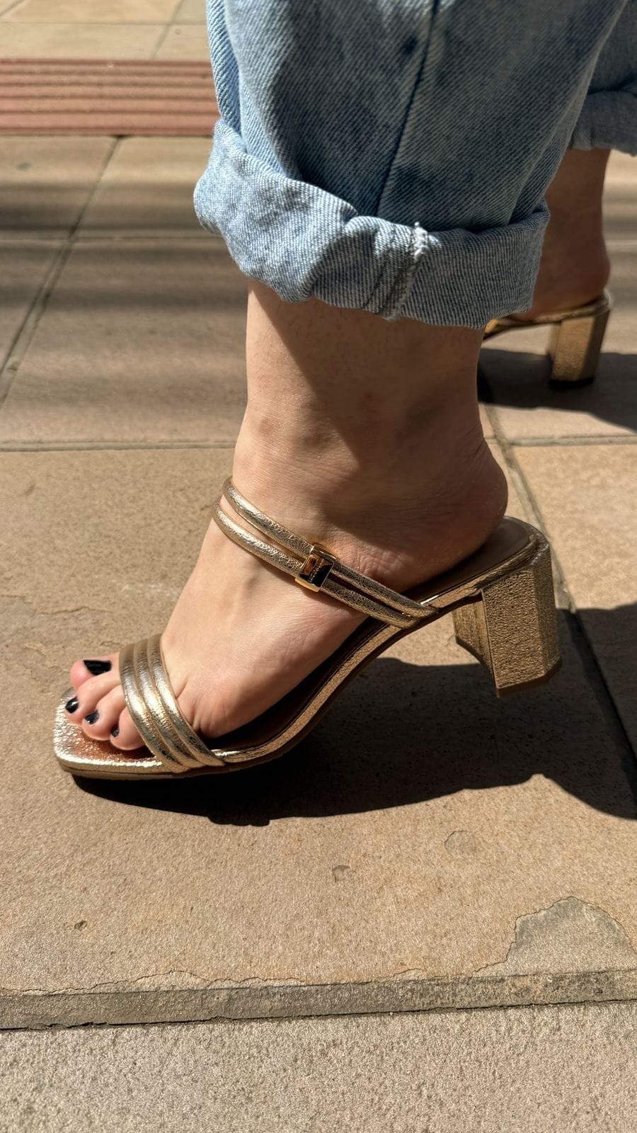 Sandália/tamanco, em couro dourado, salto grosso 5cm.