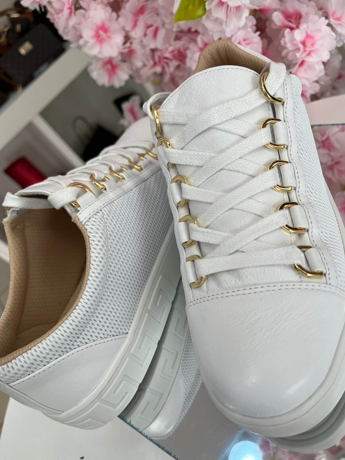 Tênis em couro na cor Branco Bianco, com textura Ravena. Possui sobreposição em couro liso, na cor do produto. O modelo tem bico arredondado e solado médio, com desenho LL na parte traseira. A amarração é com cadarços e passador dourado.