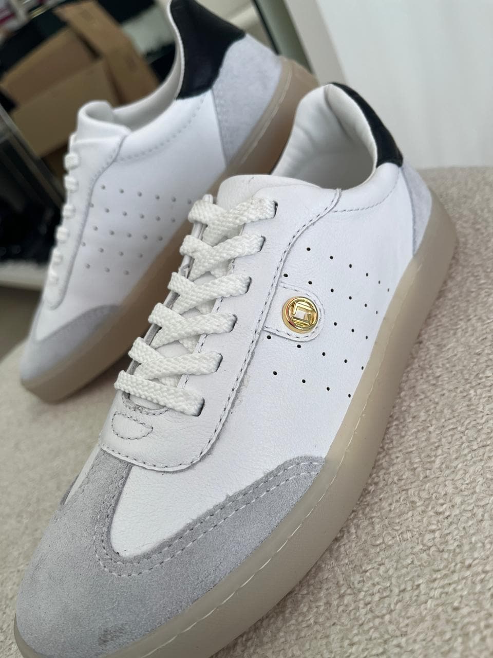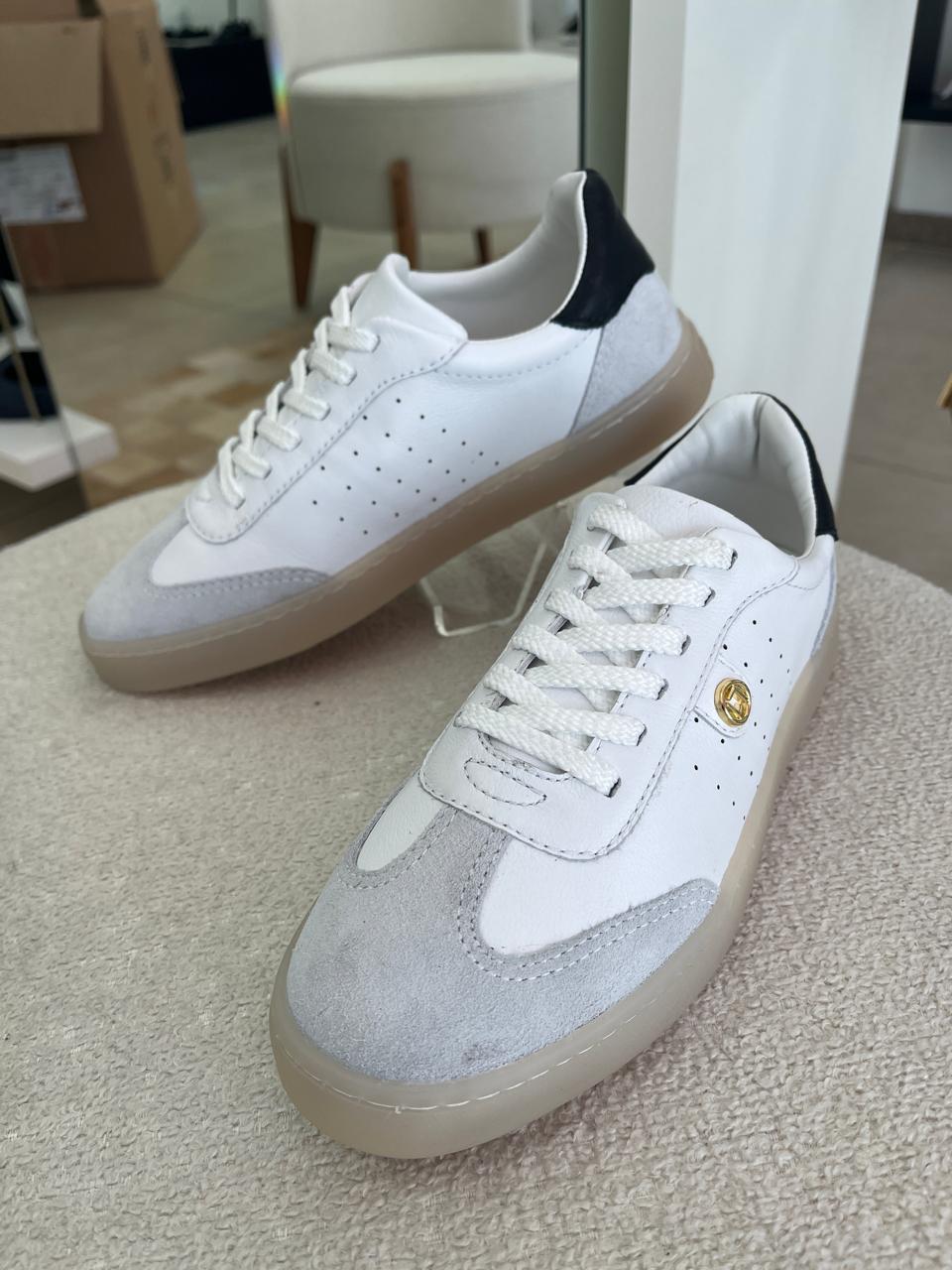 Tênis em couro branco, com aplicação em couro camurça cinza na parte da frente, e couro preto no calcanhar.