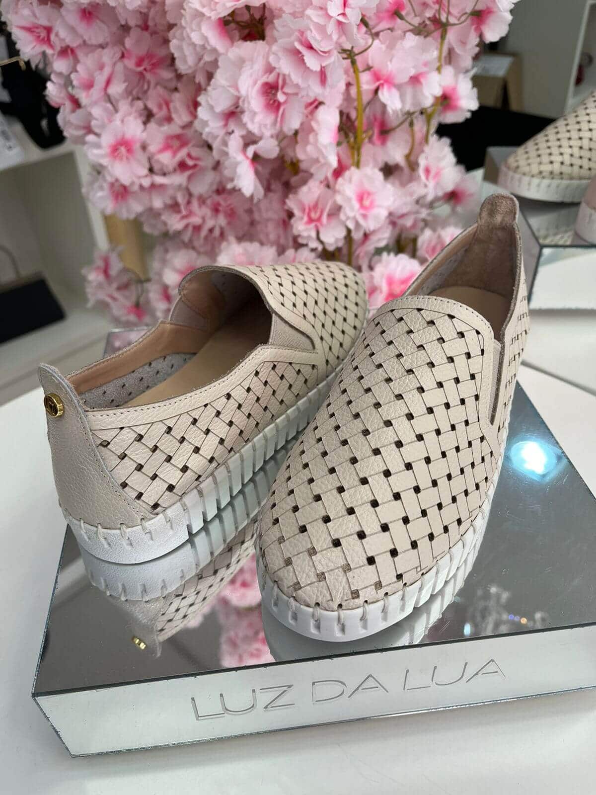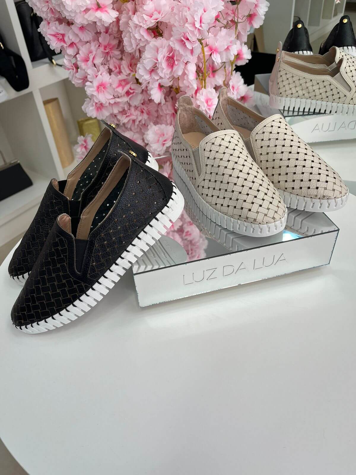 Tênis em couro na cor Off-White Panna e Preto. O modelo slip on tem cabedal com efeito vazado, feito à laser. Possui solado extraleve na cor branca. A abertura é com elástico nas laterais e puxador traseiro, facilitando o calce. Detalhe para a peça em couro liso na parte traseira, com aplicação de metal dourado exclusivo Luz da Lua.