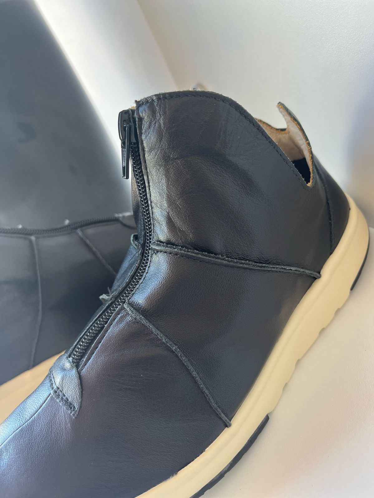 Tênis em couro pelica na cor preta, com ziper na parte superior para melhor calce.