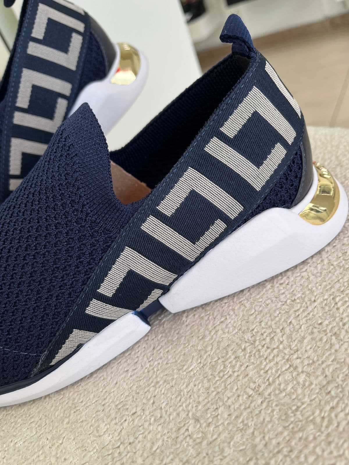 Tênis em knit azul marinho, com detalhe em gorgorão na traseira.